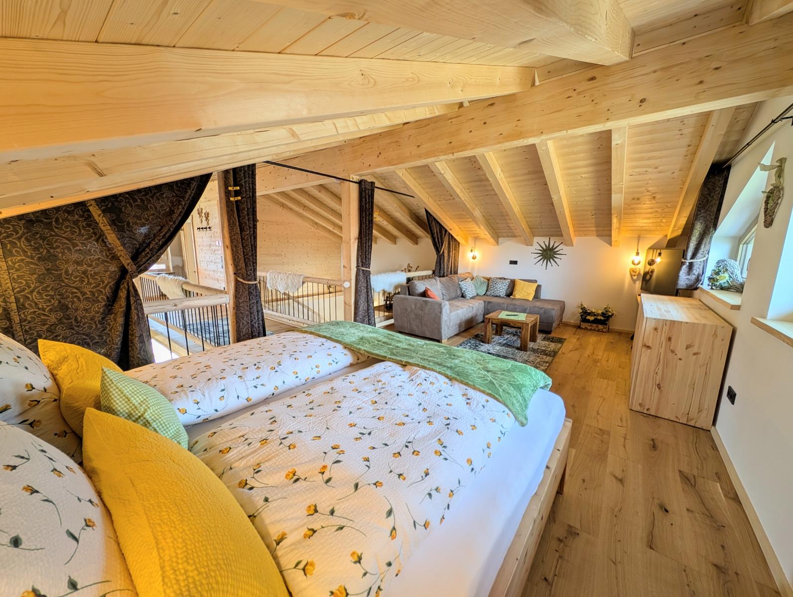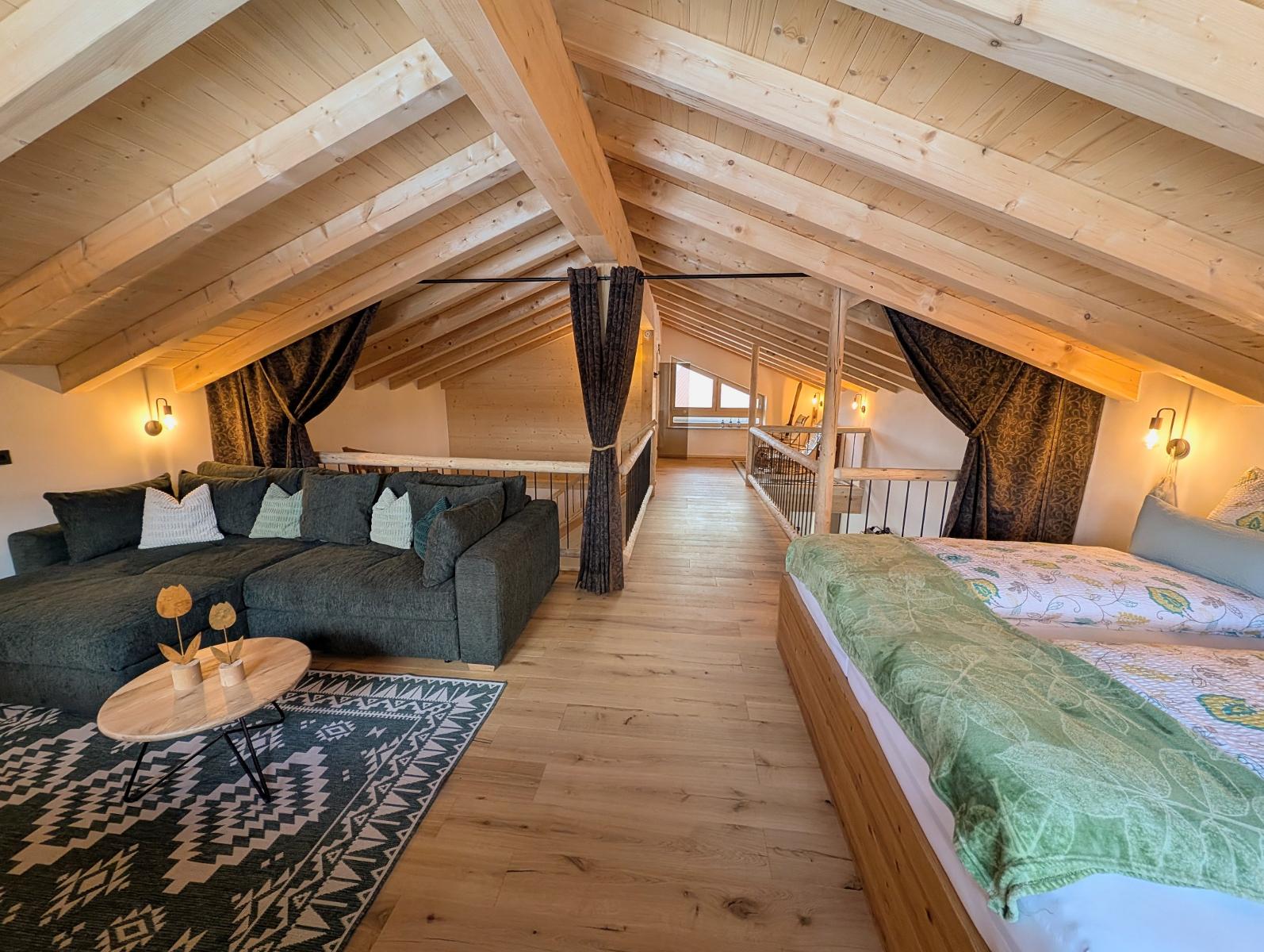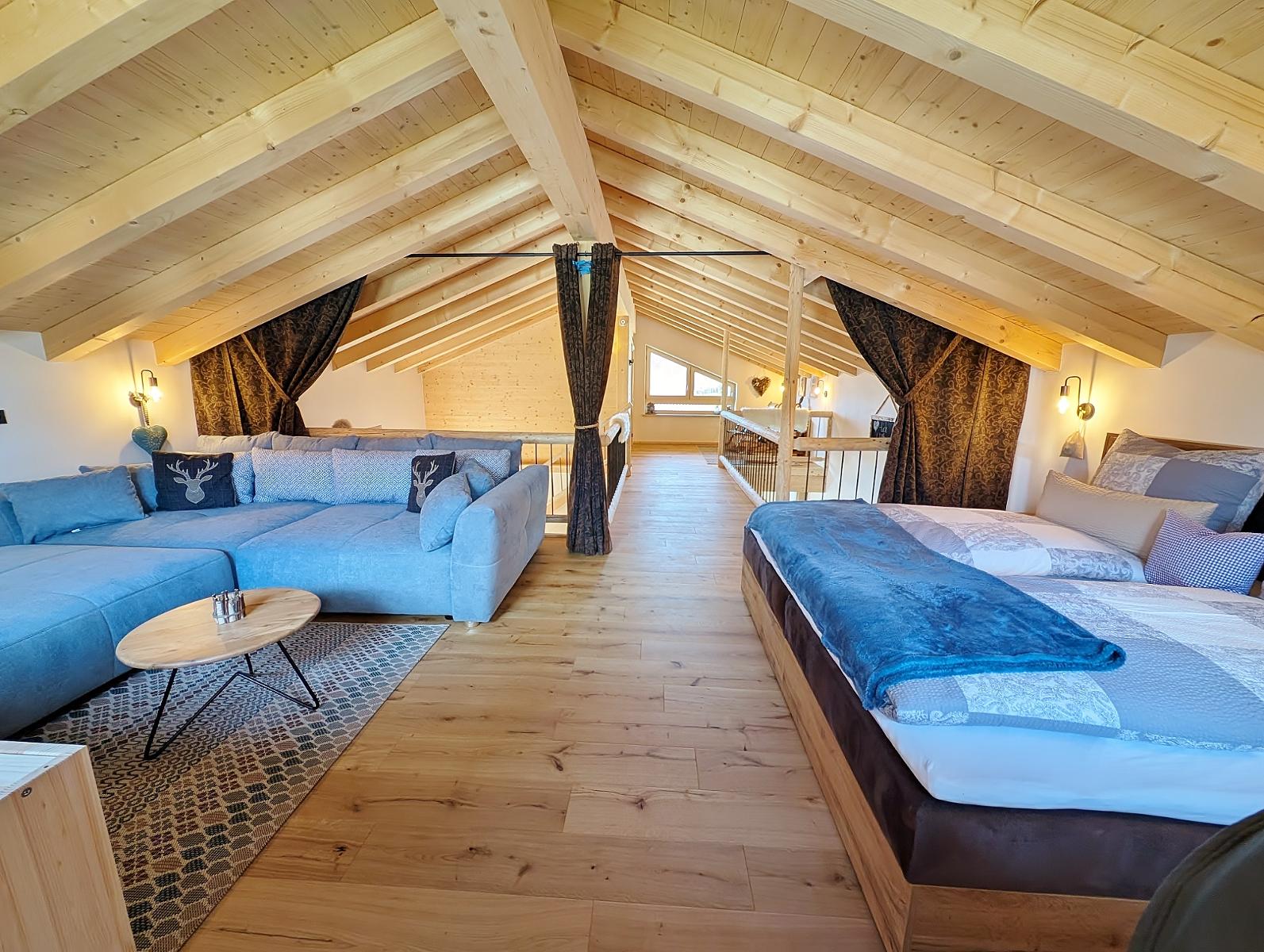 Die großzügige Schlafgalerie mit eigenem Wohnzimmer und ausziehbarem Schlafsofa im 1 Stock, bietet euch extra Komfort.