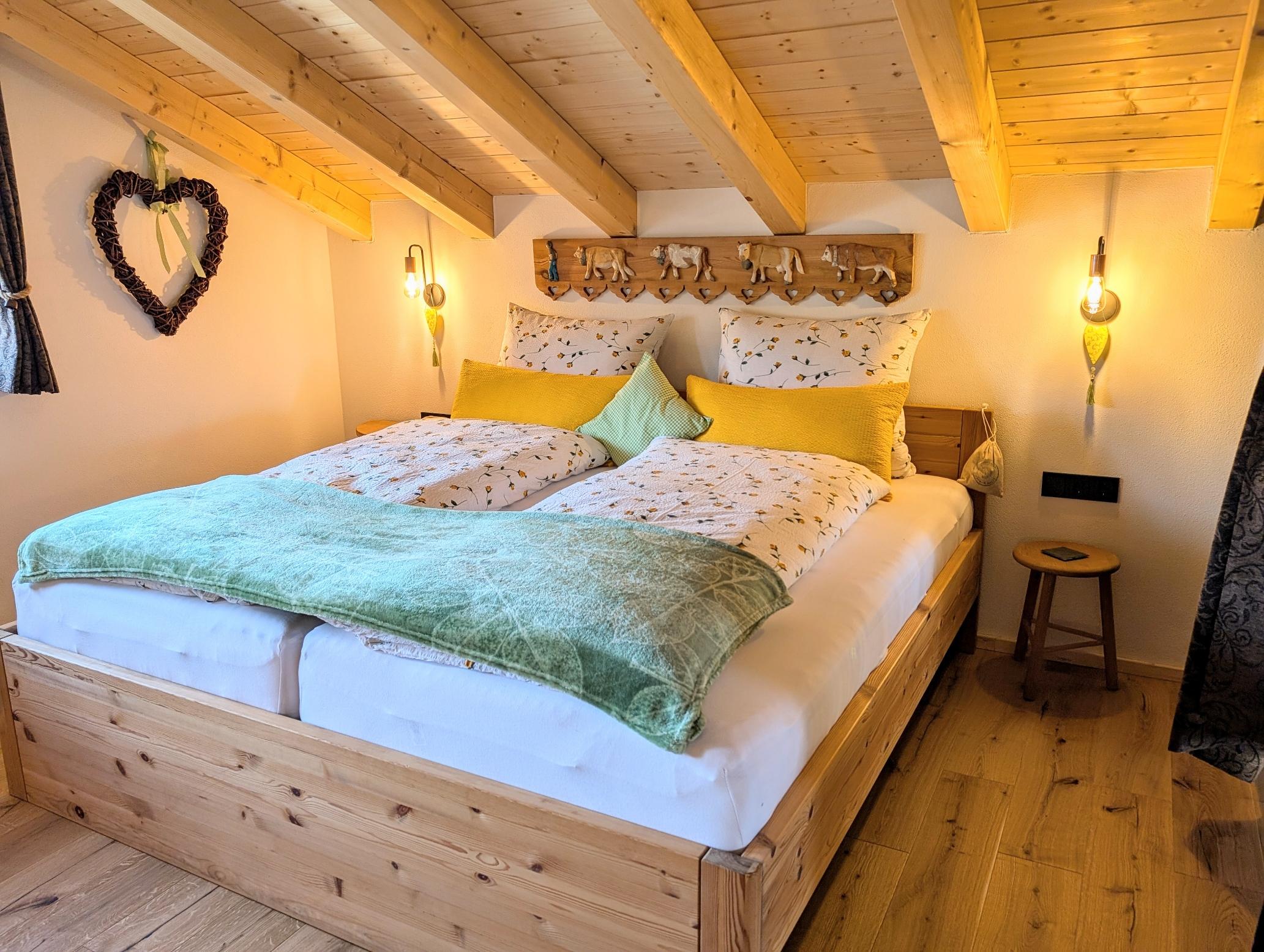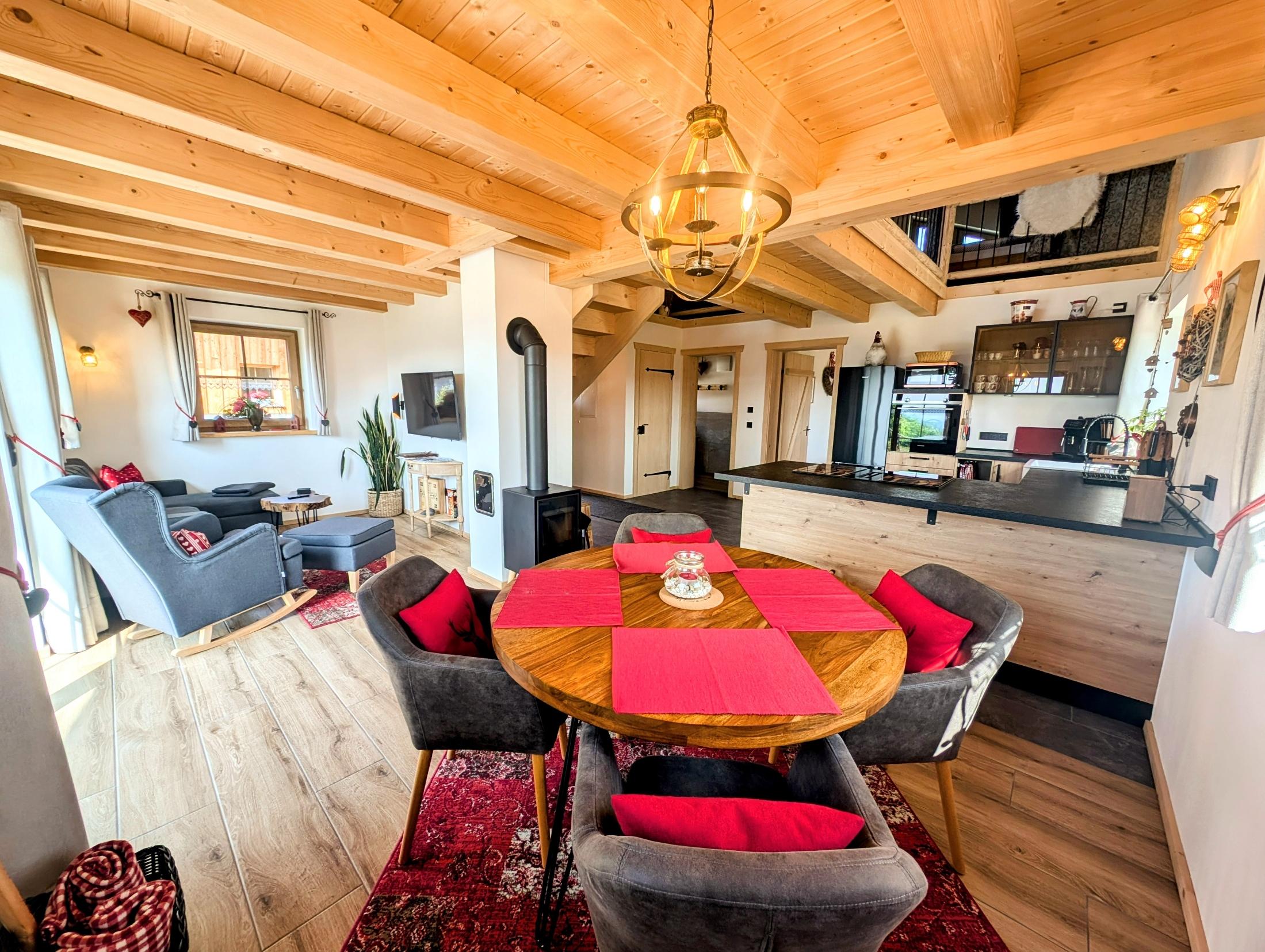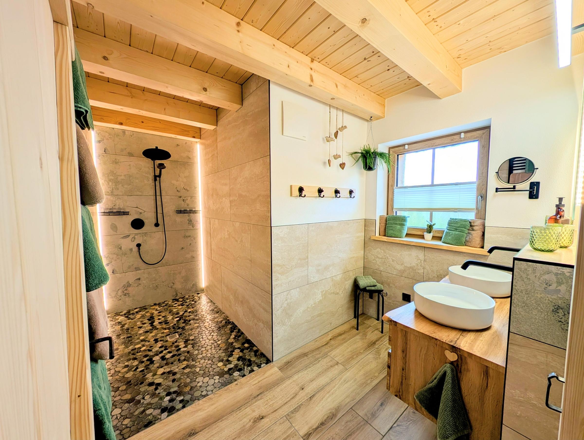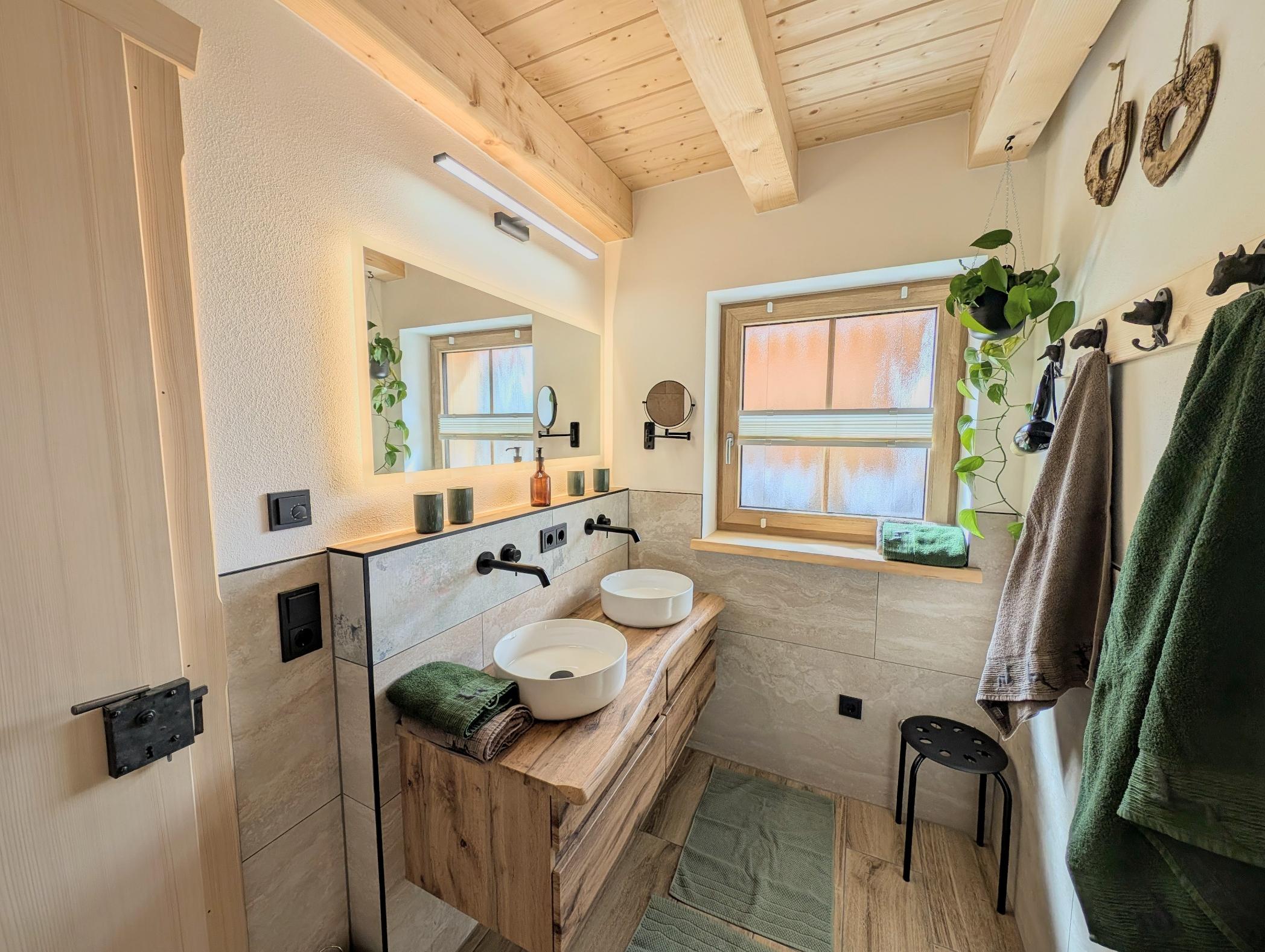 Wir setzen großen Wert auf Nachhaltigkeit und die Nutzung von unseren eigenen Baumaterialien, die aus unserem eigenen Wald stammen. Daher sind die Verschalungen, Türen, Treppen und Geländer allesamt aus diesen wertvollen Ressourcen gefertigt. Für eine behagliche Wärme und umweltfreundliche Stromversorgung sorgt unsere eigene Hackschnitzelanlage, die die Fußbodenheizung in den Chalets betreibt, sowie eine Photovoltaikanlage zur Stromgewinnung, die harmonisch in unseren Hof integriert sind.