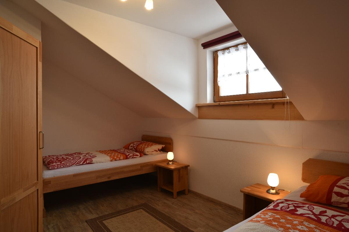 Unsere Wohnung Nr. 4 hat ein Schlafzimmer mit Doppelbett und ein Schlafzimmer mit zwei Einzelbetten, Wohnküche mit Küchenzeile und Esstisch, Polsterecke, Bad mit WC und Dusche und einen großen Balkon mit Gartenmöbeln mit Blick zum Baumwipfelpfad im Nationalpark .