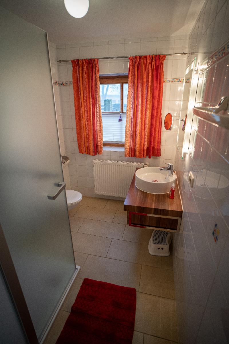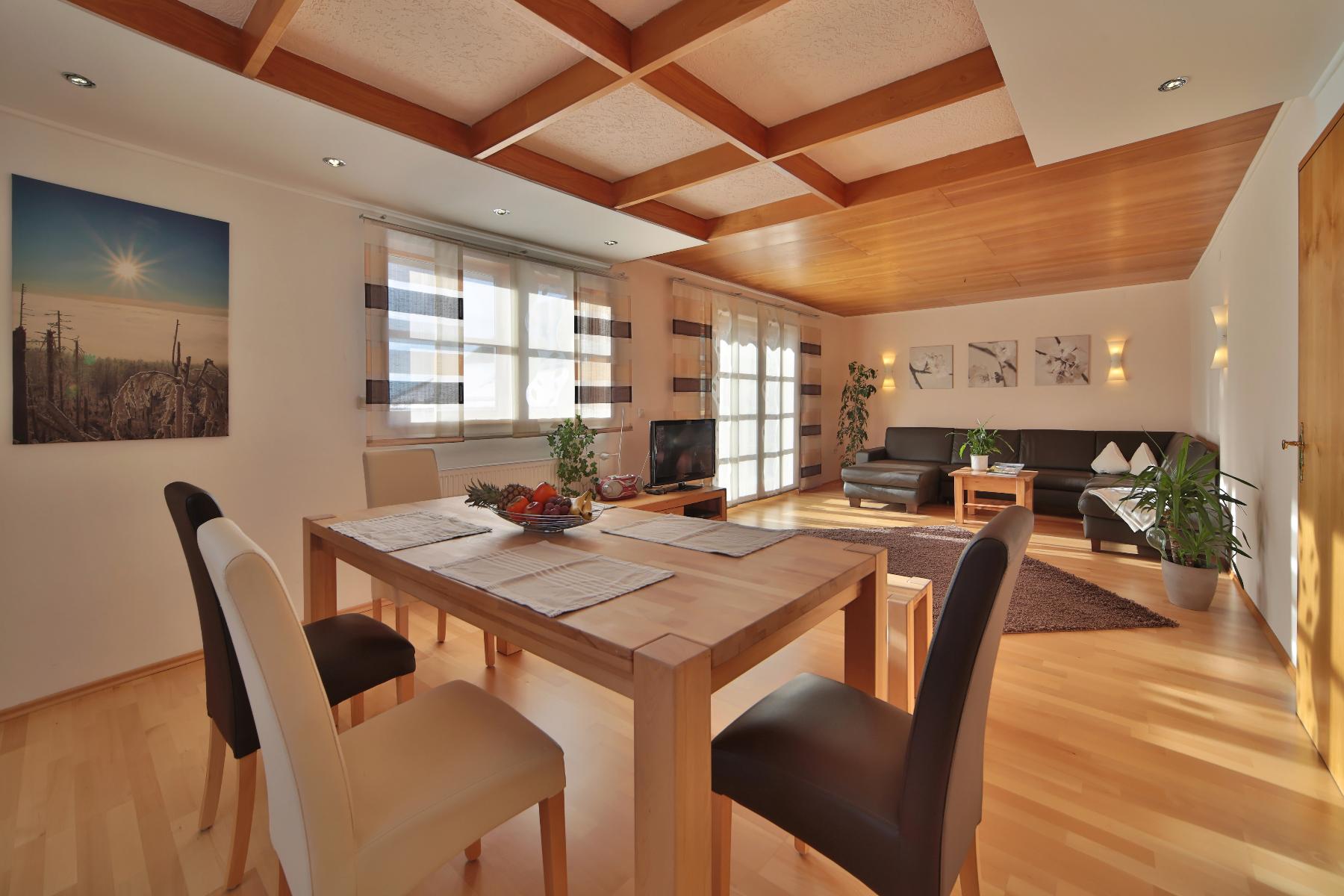 Ferienwohnung Birkhuhn ist im Nebengebäude im 1. Stock, hat ca. 85qm, ein großes Schlafzimmer und ein kleines mit Etagenbett, Diele, Dusche/WC, Bad/WC, Küche, 36 qm großer Wohn- Essraum und eine Terrasse nach Süden mit wunderbarem Weitblick bis zu den Alpen bei klarem Wetter.