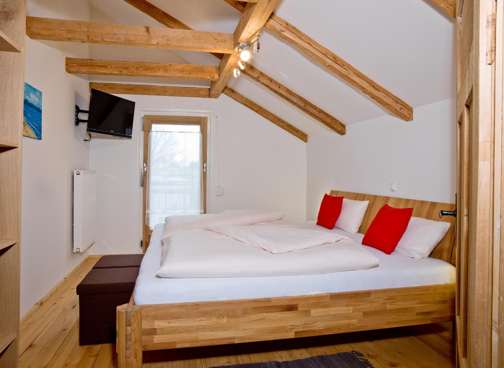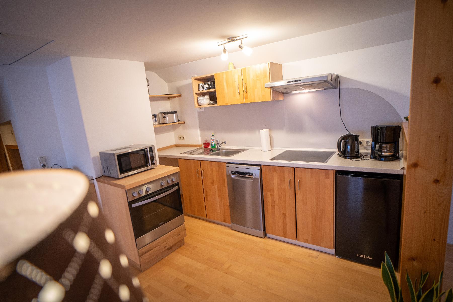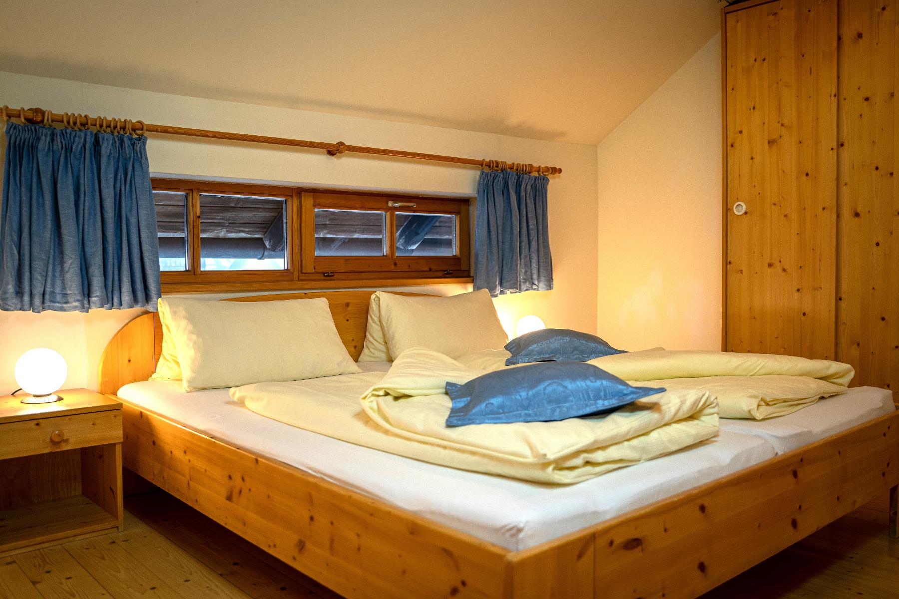 Ferienhaus Bär ist ein 100 Jahre altes, neu renoviertes Holzhaus das fast ausschließlich mit natürlichen Materialien ausgestattet wurde. Mit viel Liebe zum Detail haben wir dort Tradition mit Moderne kombiniert und auf diese Weise den typisch ländlichen Stil beibehalten und aufgewertet. Das kleine ‚Schmuckstück‘ mit eigenem Charme bietet Ihnen so ein ganz besonderes und komfortables Wohnerlebnis. Das Haus verfügt über zwei Stockwerke und ein separates Loft „die Bärenhöhle“, sowie über einen Balkon, eine vom Hof nicht einsehbare Terrasse mit eigenem Grill, einen kleinen Gewölbekeller und über ein eigenes Saunahäuschen im Garten. Die Hauptwohnung bietet ca. 90m² Wohnfläche, die Bärenhöhle, welche über eine eigenen Treppenaufstieg innerhalb der Wohnung erreichbar ist, zusätzlich ca. 45 m². Die Bärenhöhle verfügt über eine eigene Küche mit einem kleinen Esstisch für vier Personen, über ein Doppelbett sowie zwei Einzelbetten und einen Fernseher. Im unteren Stockwerk befindet sich eine Küche mit Pelletofen, großem Esstisch und offenem Durchgang zum Wohnzimmer, von dem man auf die angrenzende Terrasse gelangt. Sowie zwei  Bäder, jeweils mit WC, eines mit ebenerdiger Dusche, das andere mit freistehender Badewanne und Doppelwaschbecken, ebenfalls im unteren Stockwerk befindet sich ein Abstellraum mit Schuhregal und direkten Zugang zur Garage. Im oberen Stock befinden sich zwei Schlafzimmer mit Doppelbett und Fernseher. Von einem Schlafzimmer aus gelangt man auf den Balkon. Ein separates WC befindet sich ebenfalls im oberen Bereich. In allen Schlafräumen besteht die Möglichkeit zur vollständigen Verdunkelung.