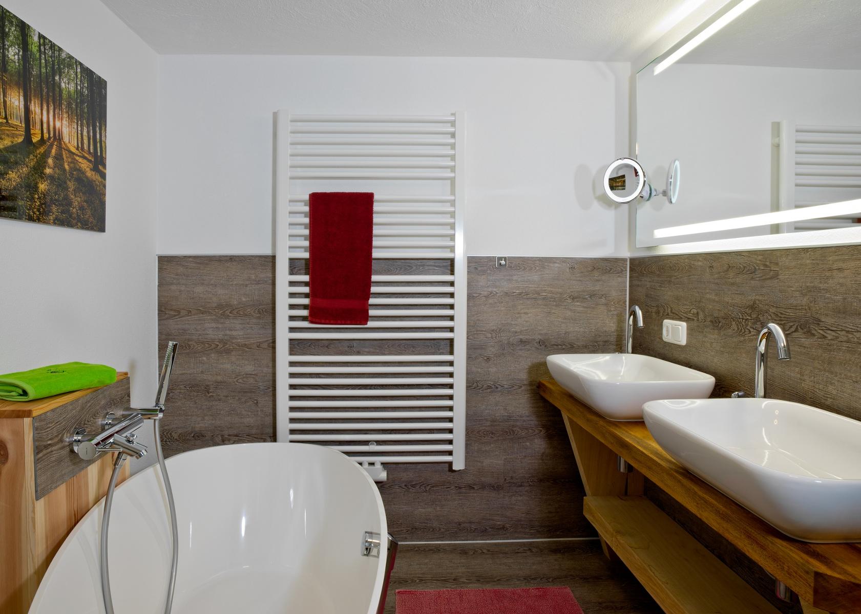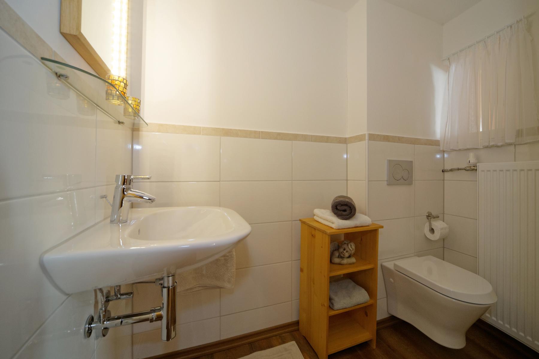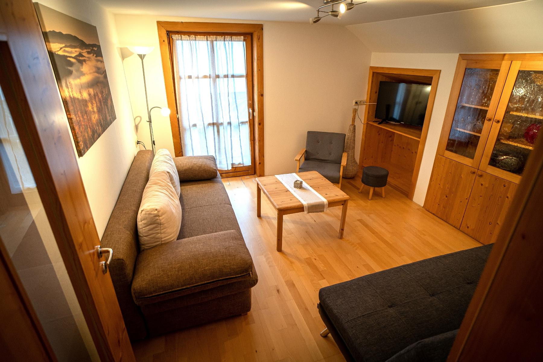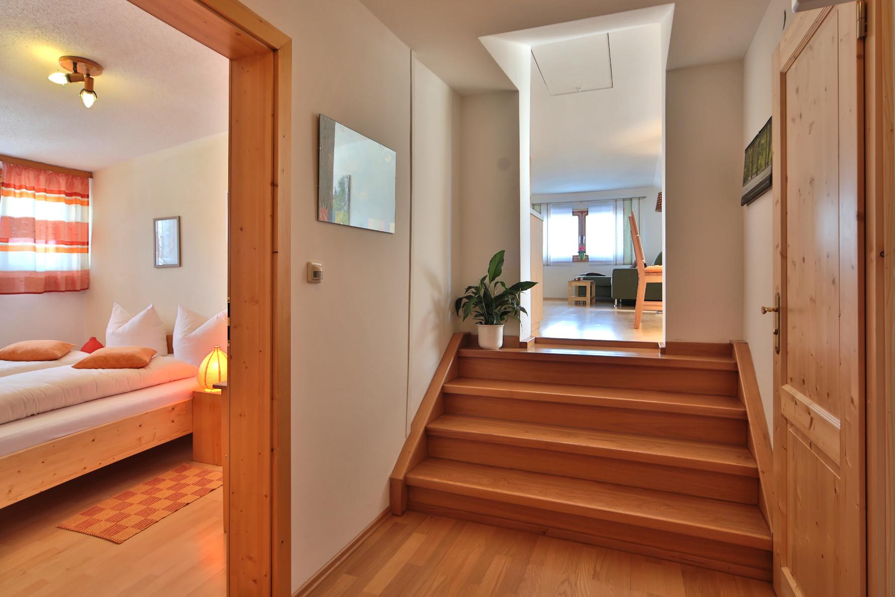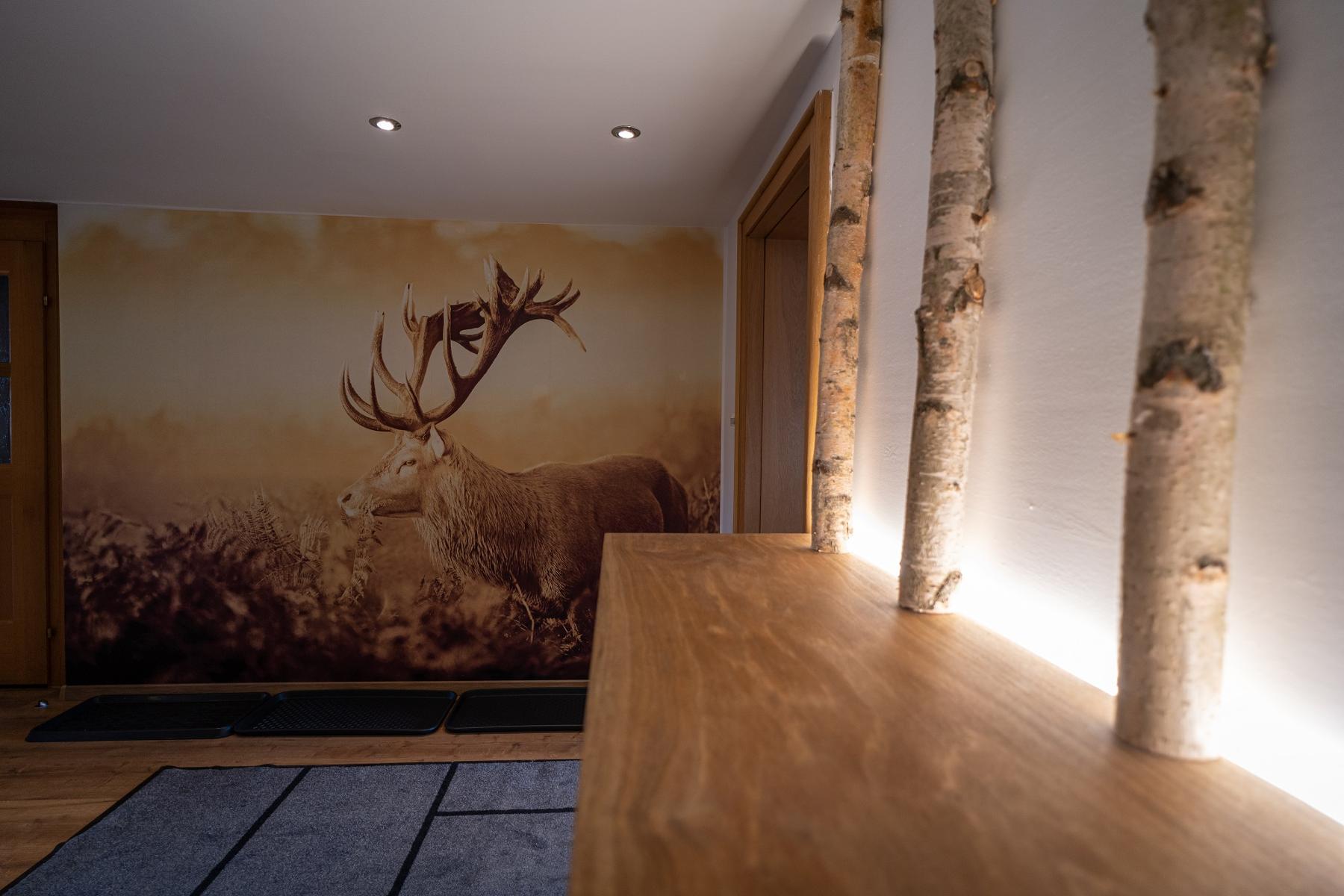 Ferienwohnung Hirsch ist im 1. Stock, hat 110qm, 4 Schlafzimmer (zwei mit je einem Doppelbett, ein Kinderzimmer mit Etagenbett und Spielebett und das vierte Schlafzimmer ist ausgestattet mit einem 140m x 200m Bett und extra Waschbecken und Dusche), Bad mit Dusche/WC und 2 Waschbecken, separates WC, Küche, Bauernstube mit Essecke, Wohnzimmer und eine Terrasse nach Süd/West.