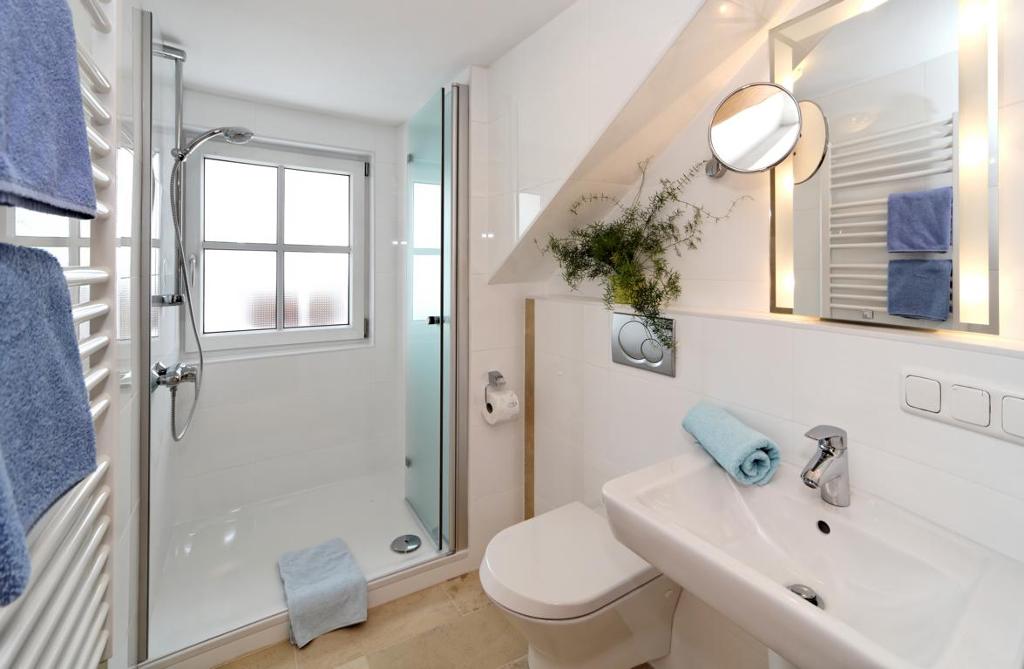Ferienwohnung Fledermaus ist im 2. Stock, hat ca. 47qm, Dusche/WC, Schlafzimmer, Diele und einen 30qm großen Wohn-Essraum mit Küche.