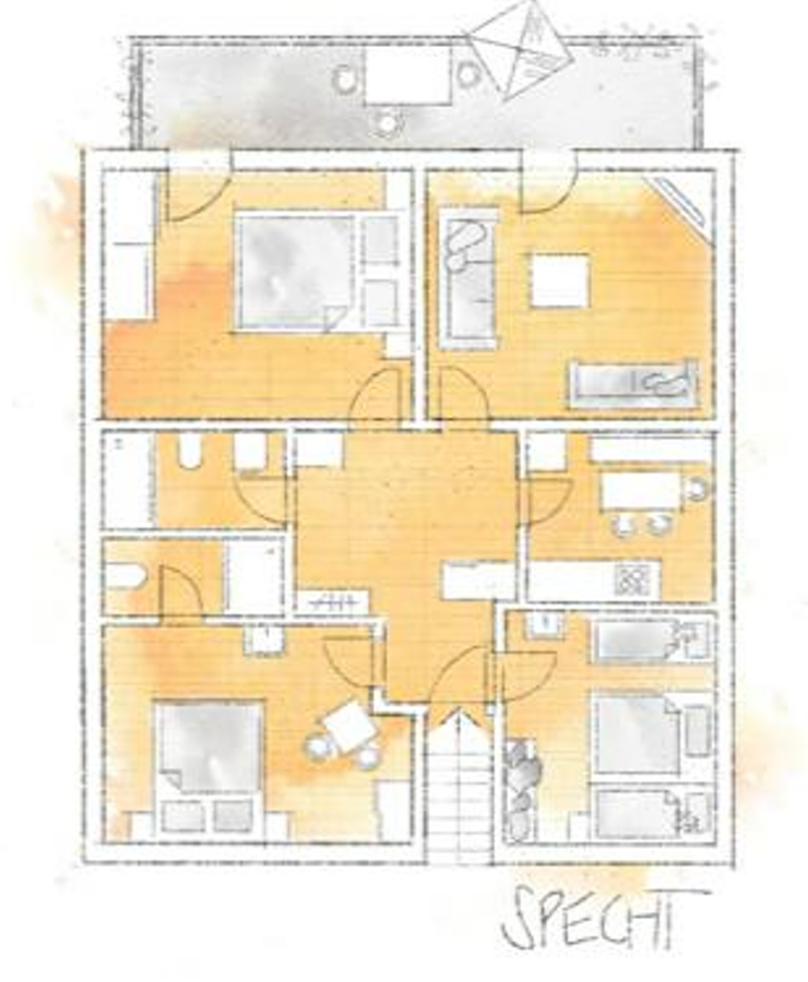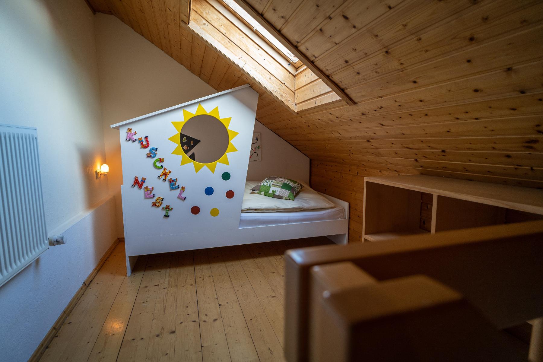 Ferienwohnung Specht ist im 2. Stock (ohne Mansarde), hat 90qm, 3 Schlafzimmer, Wohnzimmer, Küche (mit Geschirrspüler), Dusche/WC, Diele und einen Balkon nach Süden mit Blick bis zu den Alpen bei klarem Wetter. Zu den Schlafzimmer gehört ein Elternschlafzimmer mit Doppelbett, ein Kinderzimmer (20m²), ausgestattet mit Stockbett und einem Einzelbett, Smart TV, extra Waschbecken und einer kindgerechten Besonderheit, ein liebevoll gestaltetes 'Kuschelnest', das die Kinder für sich als Spiel- und Rückzugsoase nutzen können. Das dritte Schlafzimmer (18m²), verfügt über ein Doppelbett, extra Dusche/WC und Smart TV.