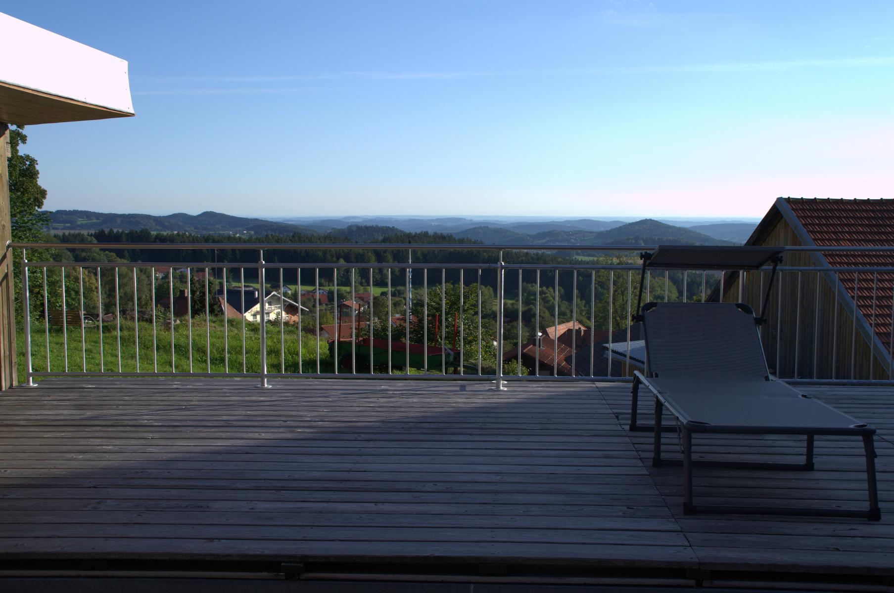 Ferienwohnung Luchs ist im 1. Stock, hat ca. 85qm, im unteren Bereich ist eine große Wohnküche mit Couch und Terrasse (40qm mit Blick zu den Tieren und den Bayerwaldbergen Rachel und Lusen) sowie ein Schlafzimmer mit Doppelbett und Dusche/WC. Im oberen Bereich befindet sich ein abgeschlossenes Zimmer mit 2 Einzelbetten und ein offener Bereich der z.B. als Spielgalerie genutzt werden kann.