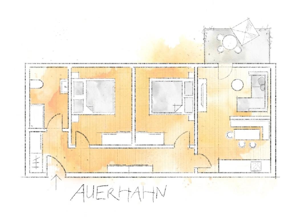Ferienwohnung Auerhahn ist im Erdgeschoß, hat 60 qm, 2 Schlafzimmer, Dusche/WC, Diele, eine Wohnküche und eine Terrasse mit direktem Zugang zum Garten mit den Spielgeräten.