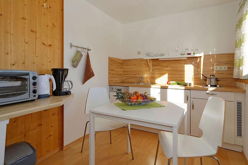 Ferienwohnung Eule ist im 1. Stock, hat 60 qm, 2 Schlafzimmer (eines mit einem Doppelbett das andere mit 2 Einzelbetten), Dusche/WC, Diele, eine Wohnküche und einen Balkon nach Westen/Garten.