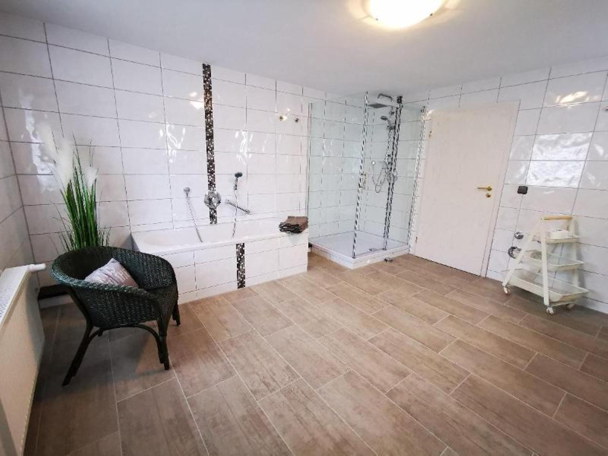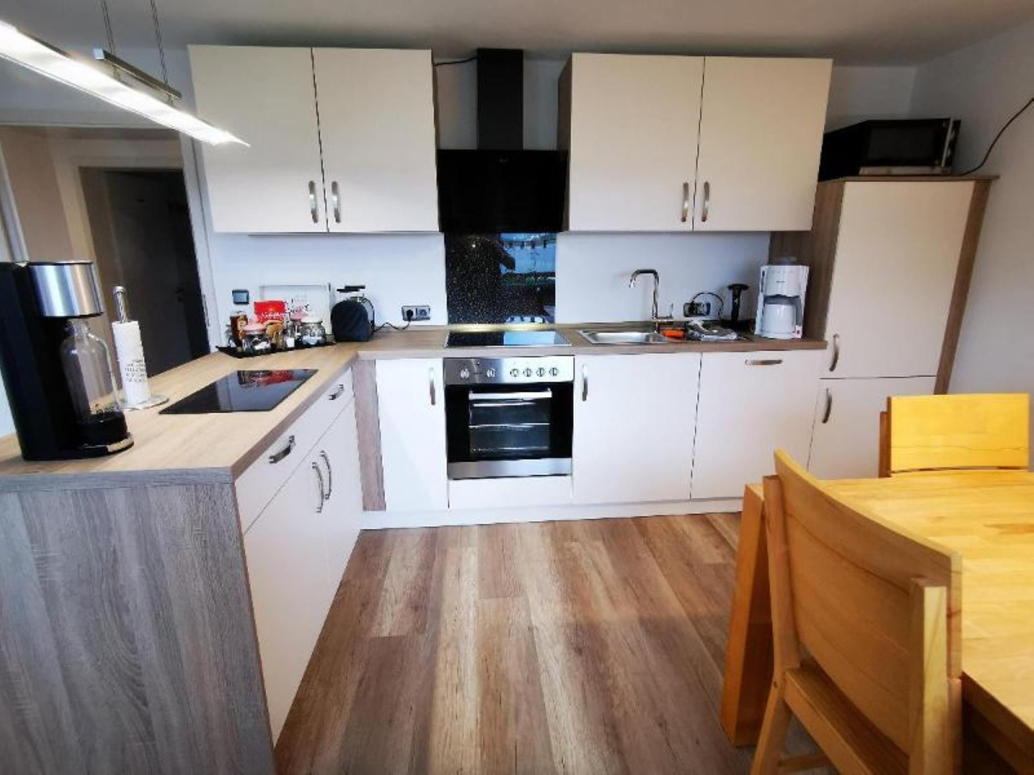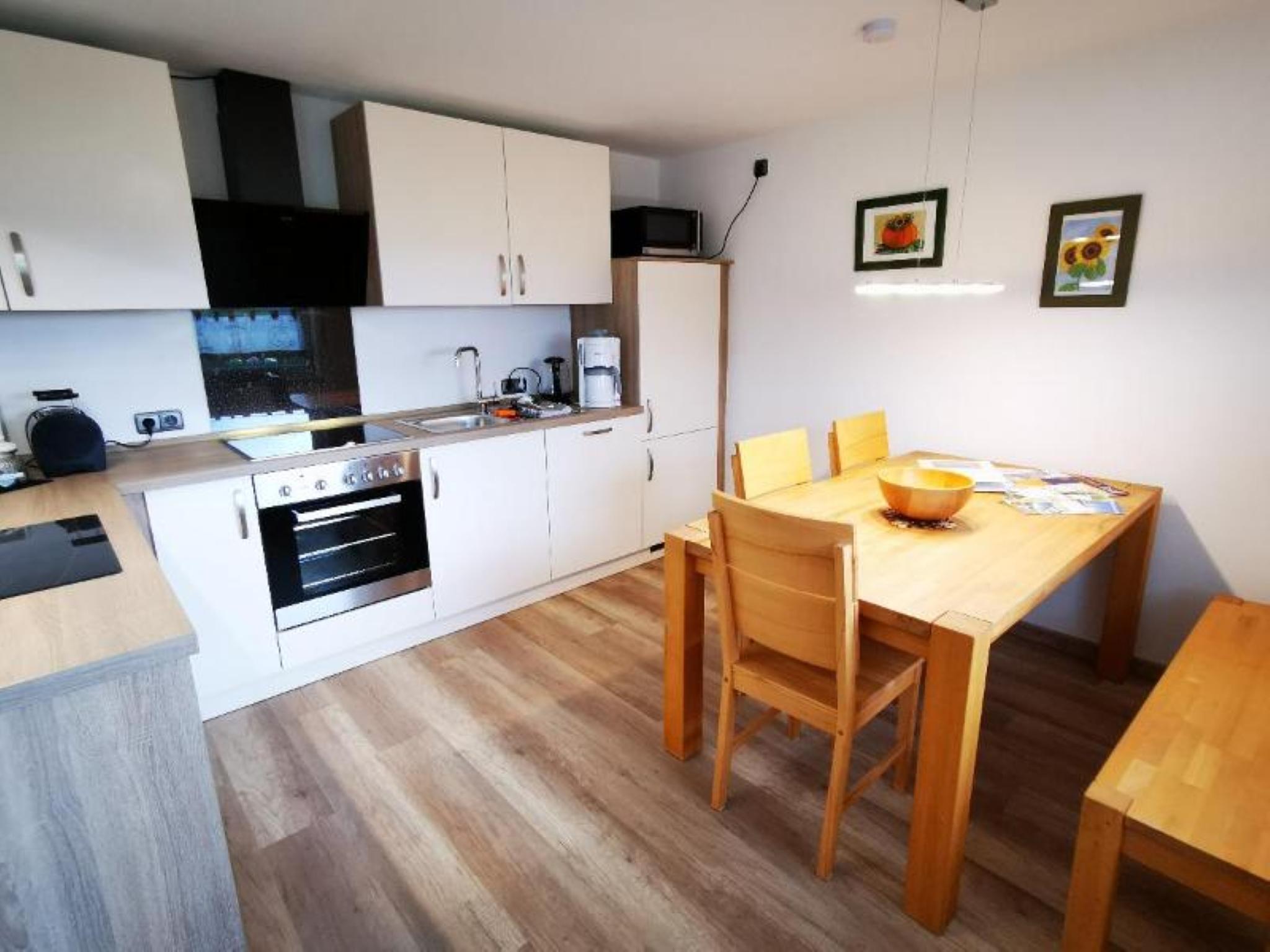 Unsere Ferienwohnung mit 100 m² Wohnfläche im 1. Stock bietet Platz für 2-4 Personen. Das gemütliche Wohnzimmer mit Schlafsofa und Flachbild-TV lädt zum Verweilen ein. Die komplett ausgestattete Küche mit Geschirrspüler, Kühlschrank incl. Gefrierfach, Herd, Backofen, Mikrowelle, Wasserkocher, Toaster und Kaffeemaschine lässt keine Wünsche offen. Die Ferienwohnung verfügt über zwei Schlafzimmer mit je einem Doppelbett. Das geräumige Badezimmer mit Wellnessdusche (niedrige Duschwanne), Badewanne, Föhn, Handtuchtrockner und WC rundet das Gesamtbild ab. Zusätzlich steht Ihnen noch ein separates WC zur Verfügung. Vor allem im Sommer können Sie entspannte Grillabende in unserem Garten verbringen. Haustiere sind erlaubt (max. 2 kleine Hunde, Hunde über 35 cm Schulterhöhe sind auf 1 Tier beschränkt). Das WLAN und den Parkplatz vor dem Haus können Sie kostenfrei nutzen.