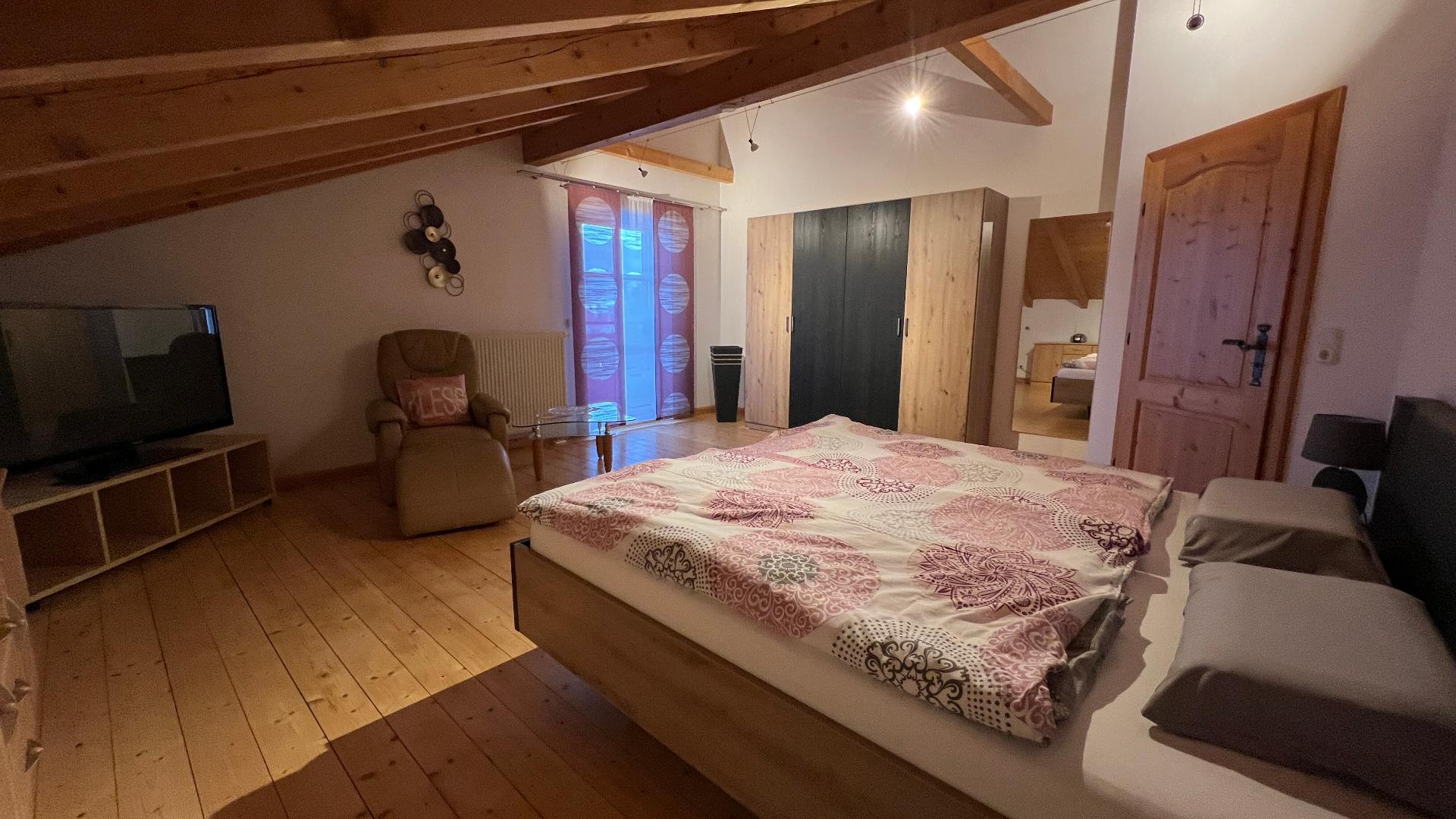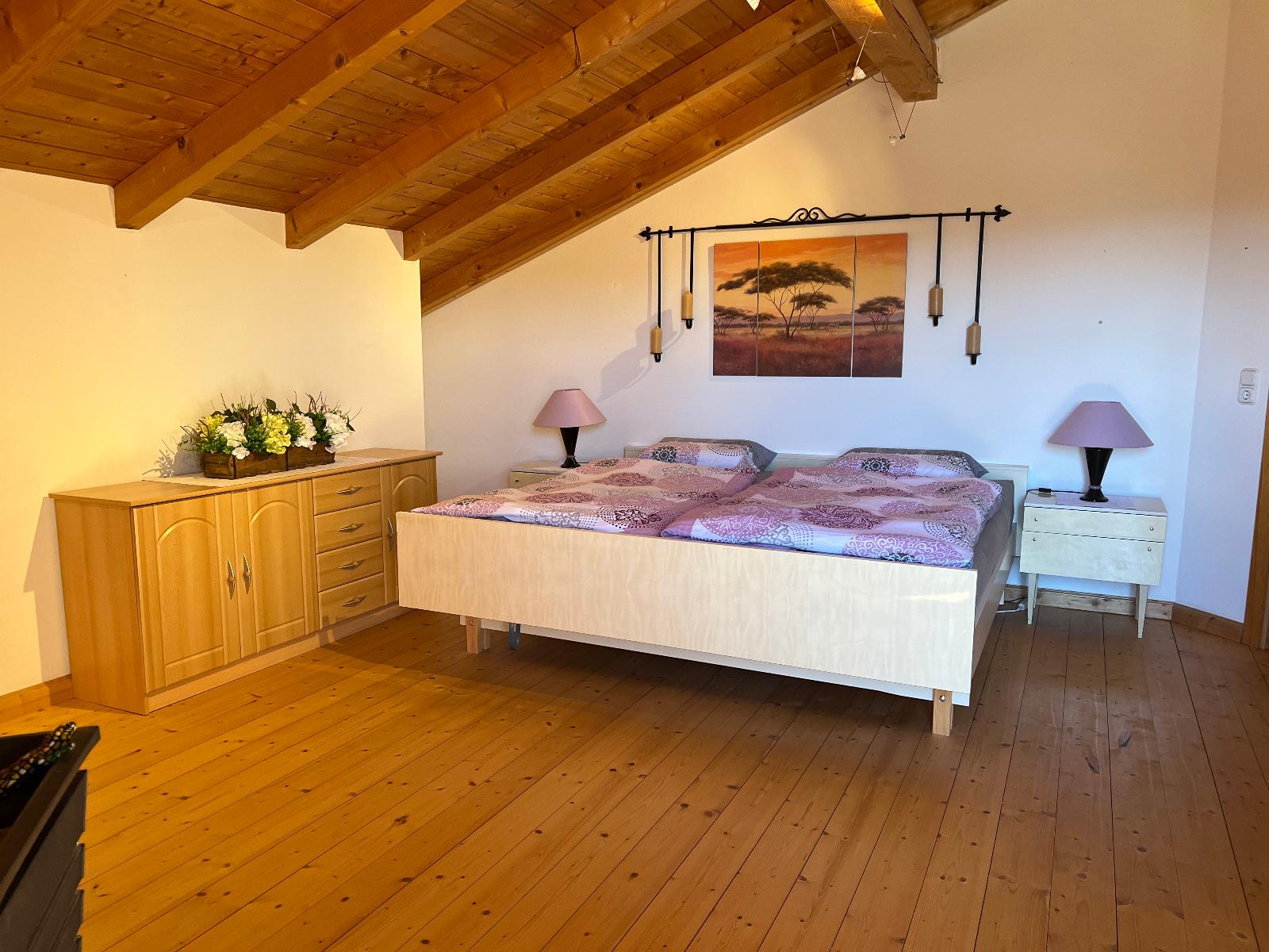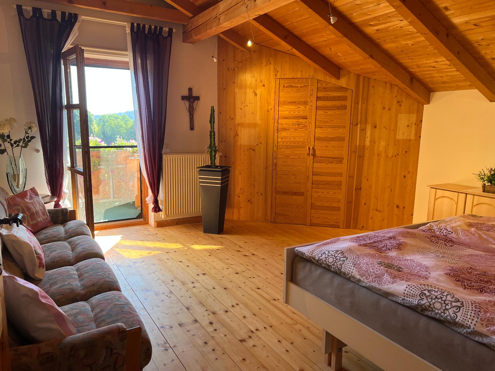 Unsere gemütliche Ferienwohnung "Ausblick" befindet sich im Haus der Vermieter im 1. Stock (Mansarde) und bietet Platz für 2-4 Personen und ein Babybeistellbett.