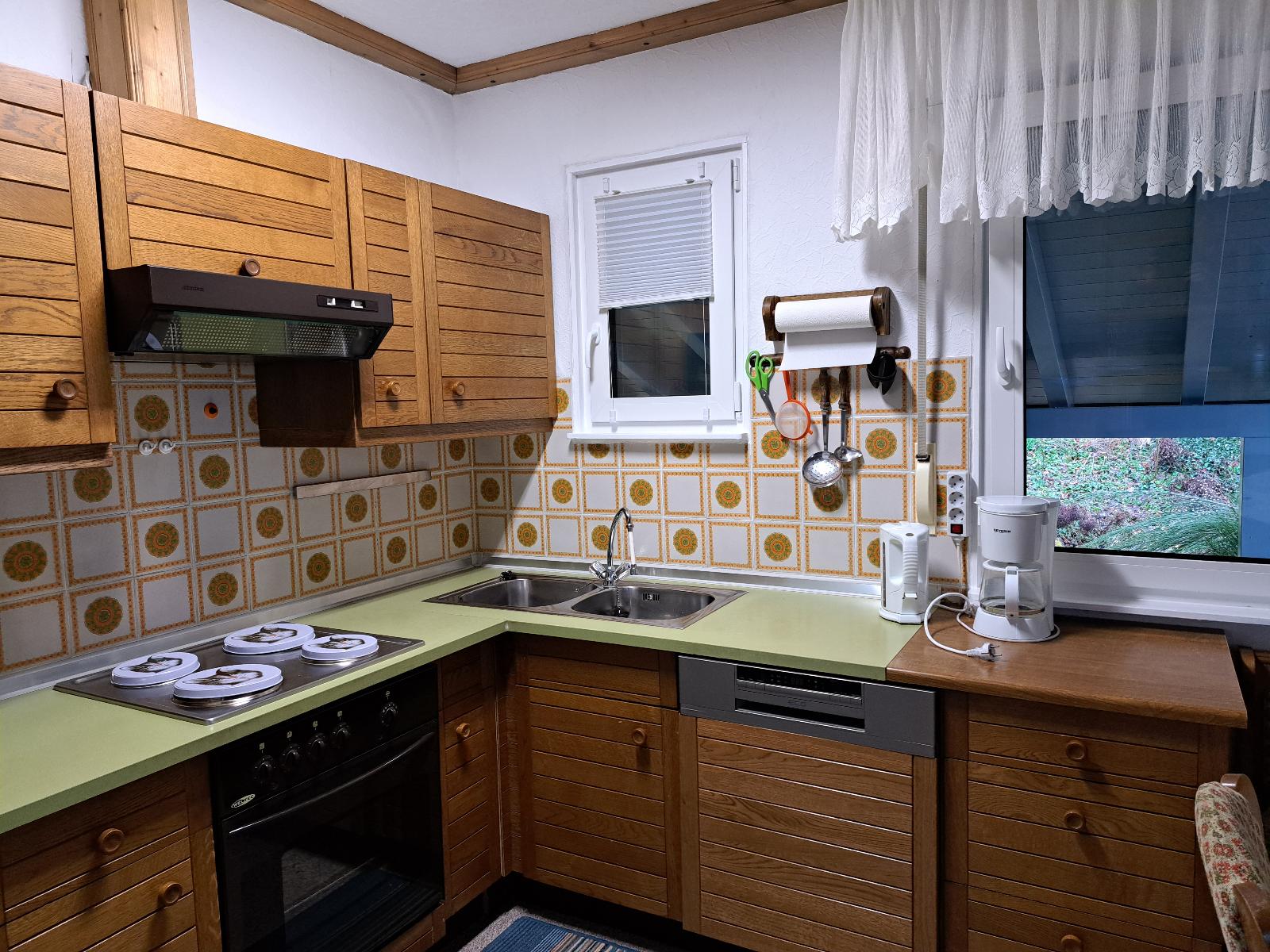 Wohnküche, Küchenbereich ausgestattet mit Elektroherd mit Backofen, Kühlschrank / Gefrierschrank, Spülmaschine, Kaffeemaschine, Wasserkocher, Eierkocher, Toaster, Brotschneidemaschine, Mikrowelle, Essecke.