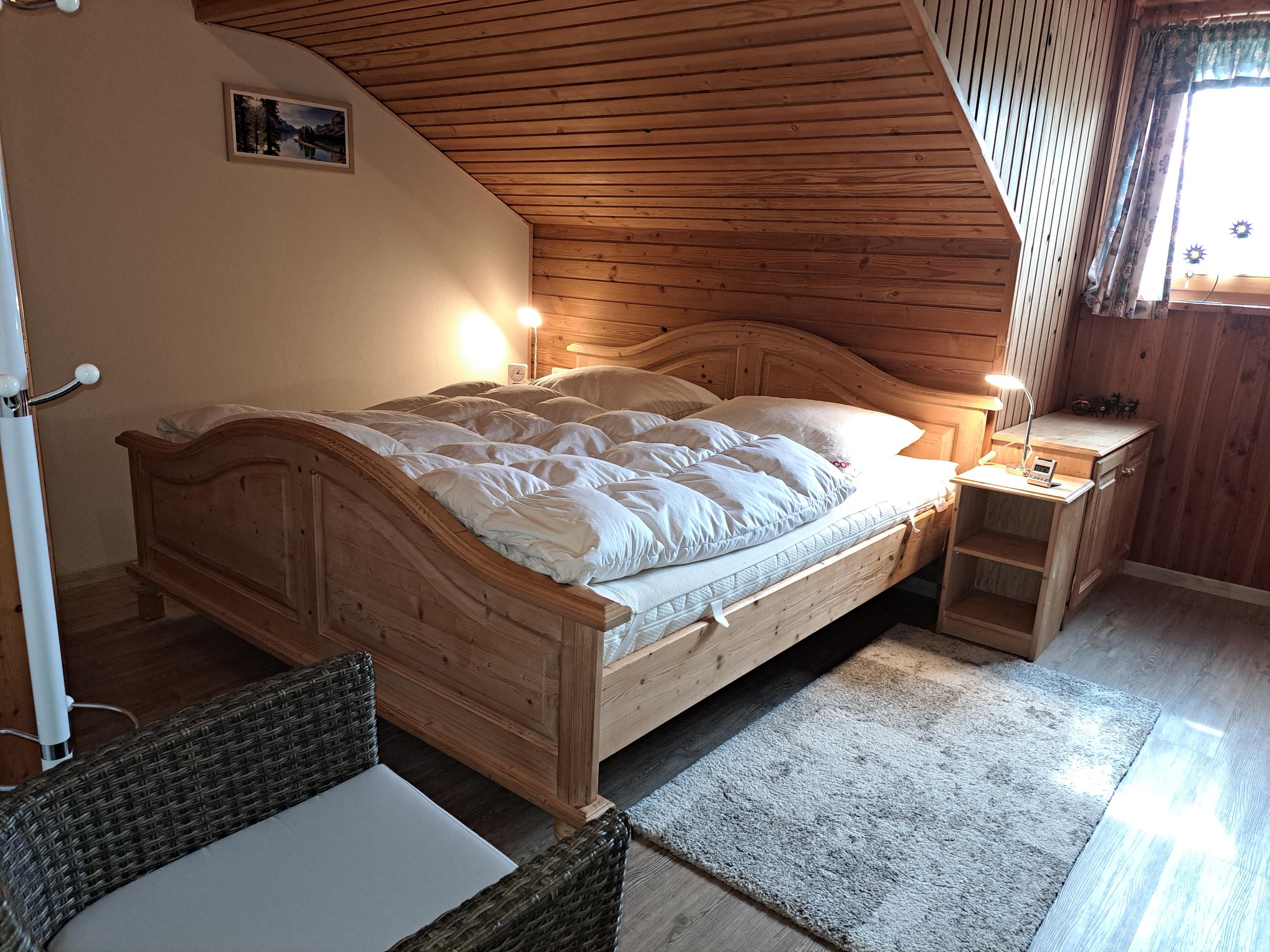 Die Ferienwohnung 1 (52 qm) ist geeignet für 2 Personen und ausgestattet mit einem Schlafzimmer (aus Naturholz, Schreinerware), einem Wohnraum mit kompletter Küche, Balkon mit Glasüberdachung