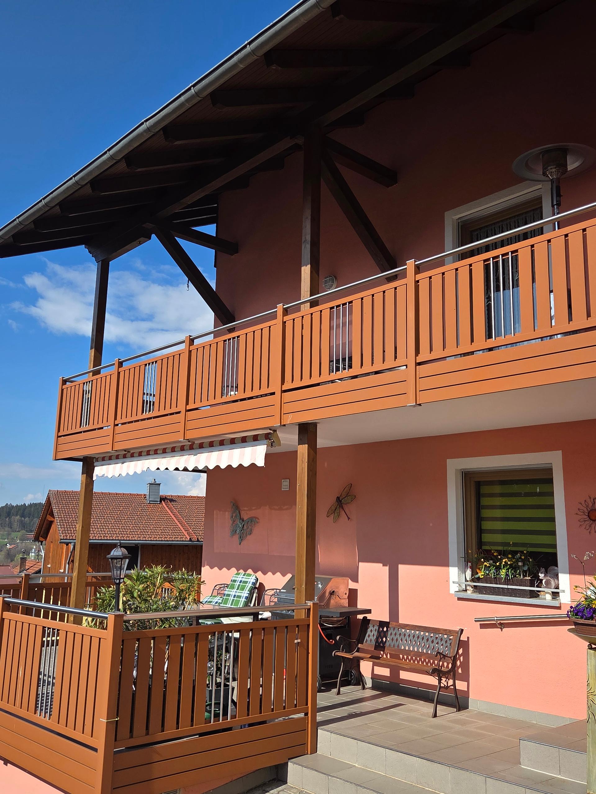 Südbalkon vom Esszimmer mit 2 Rattanstühle und einen Tisch ausgestattet.