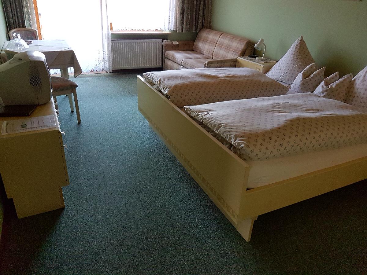 Im gemütlichen Dreibettzimmer mit Balkon steht ein bequemes Doppelbett, eine Schlafcouch (bietet Platz für eine weitere Person), ein Tisch mit Stühlen und ein Fernseher. Das Bad besteht aus Dusche und WC. Bettwäsche und Handtücher sind vorhanden. Auf dem schönen, großen Balkon können Sie die Sonne und herrliche Aussicht genießen. Der Balkon ist mit Tisch und Relaxliegen mit Auflagen ausgestattet. Ab sofort kostenloses WLAN auf allen Zimmern.