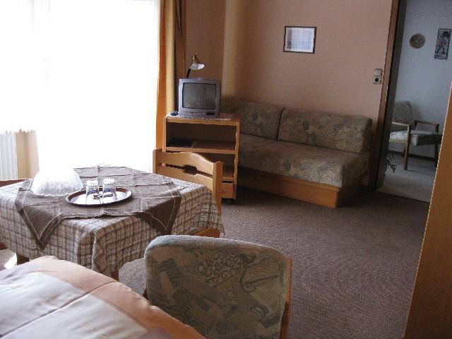 Großzügige Ferienwohnung (100qm) für bis zu 6 Personen. In der Wohnung befindet sich ein Schlafzimmer mit Doppelbett, ein Kinderzimmer mit Einzelbett sowie ein großer Wohn-/Schlafraum mit einem weiteren Doppelbett und TV. Die FeWo verfügt außerdem über eine voll ausgestattete Küche mit Kaffeemaschine, Toaster, Herd mit Backofen, Spülmaschine, Geschirr, Besteck und Eierkocher und eine Essecke. Das große Bad ist ausgestattet mit Dusche, Badewanne, WC und Bidet. Es gibt zudem noch ein separates WC. Das Schlafzimmer und der Wohn-/Schlafraum verfügen über einen Zugang zur Terrasse mit Markise, Tisch und Relaxliegen. Brötchenservice möglich. Kostenloser WLAN-Zugang und Parkplatz sind im Preis enthalten. Gäste erhalten zudem Zugang zu Solarium, Skikeller, Fitness- und Tischtennisraum, Sonnenterrasse.