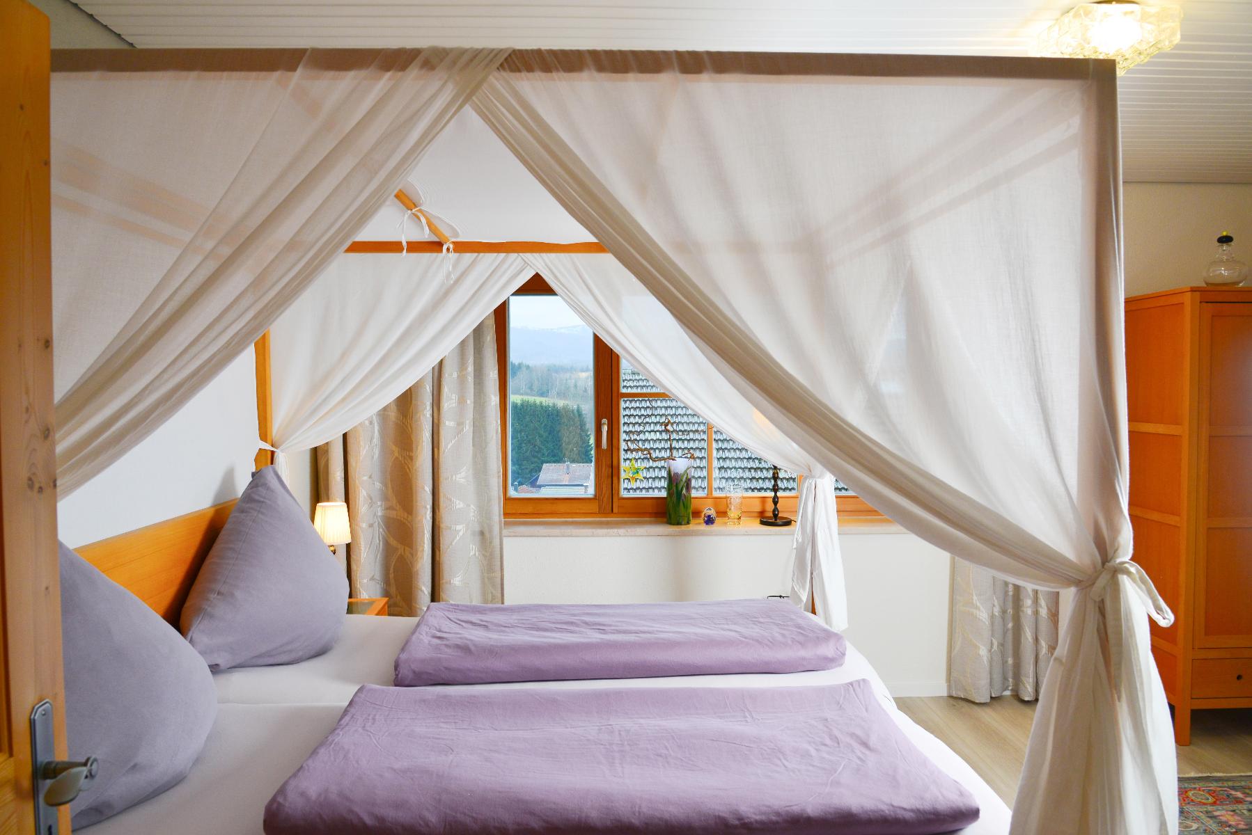 Traumhaft schönes Himmelbett mit Naturschlafkomfortmatratze von Grüne Erde laden Sie zum entspannten Schlaf.