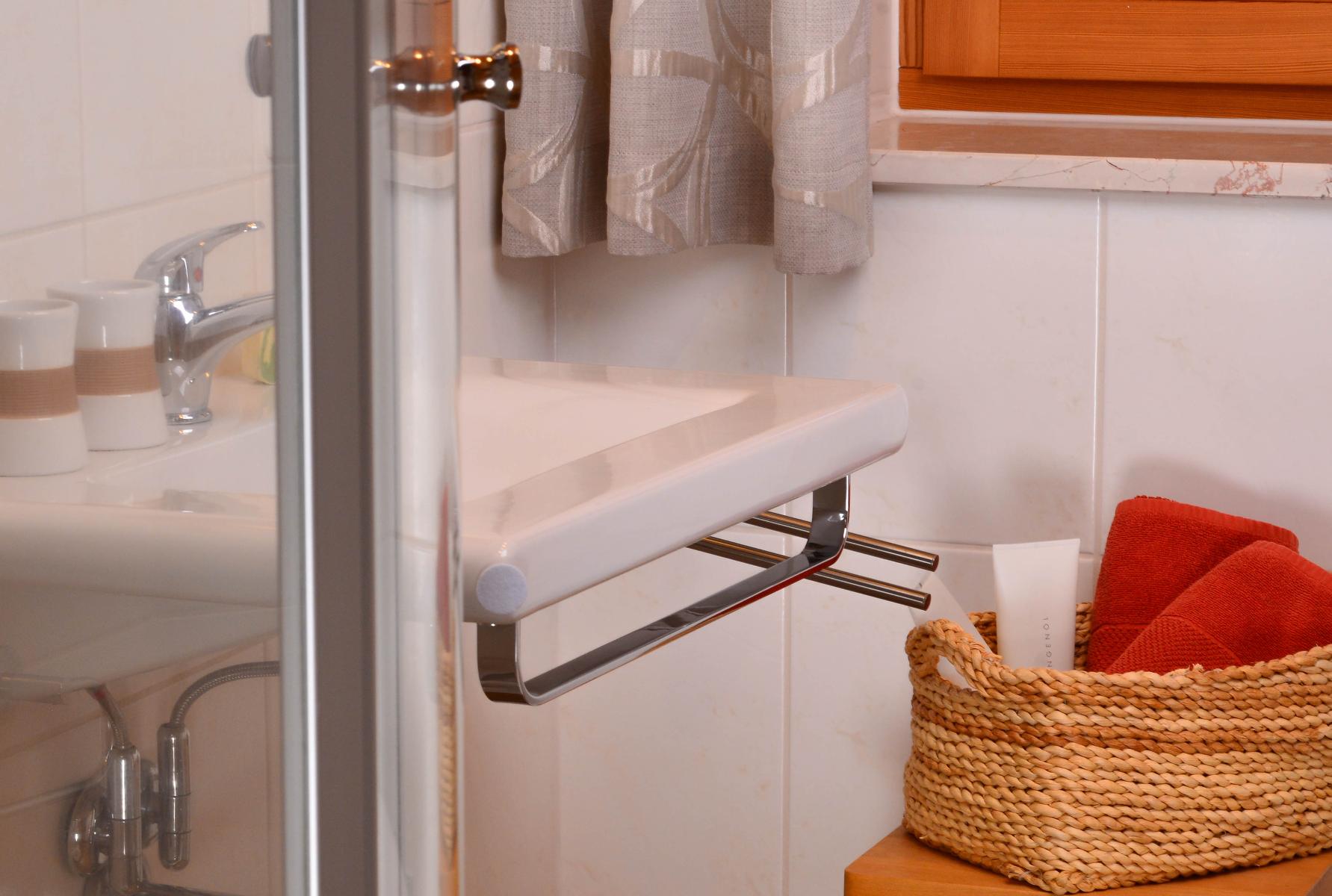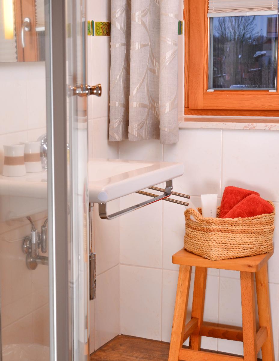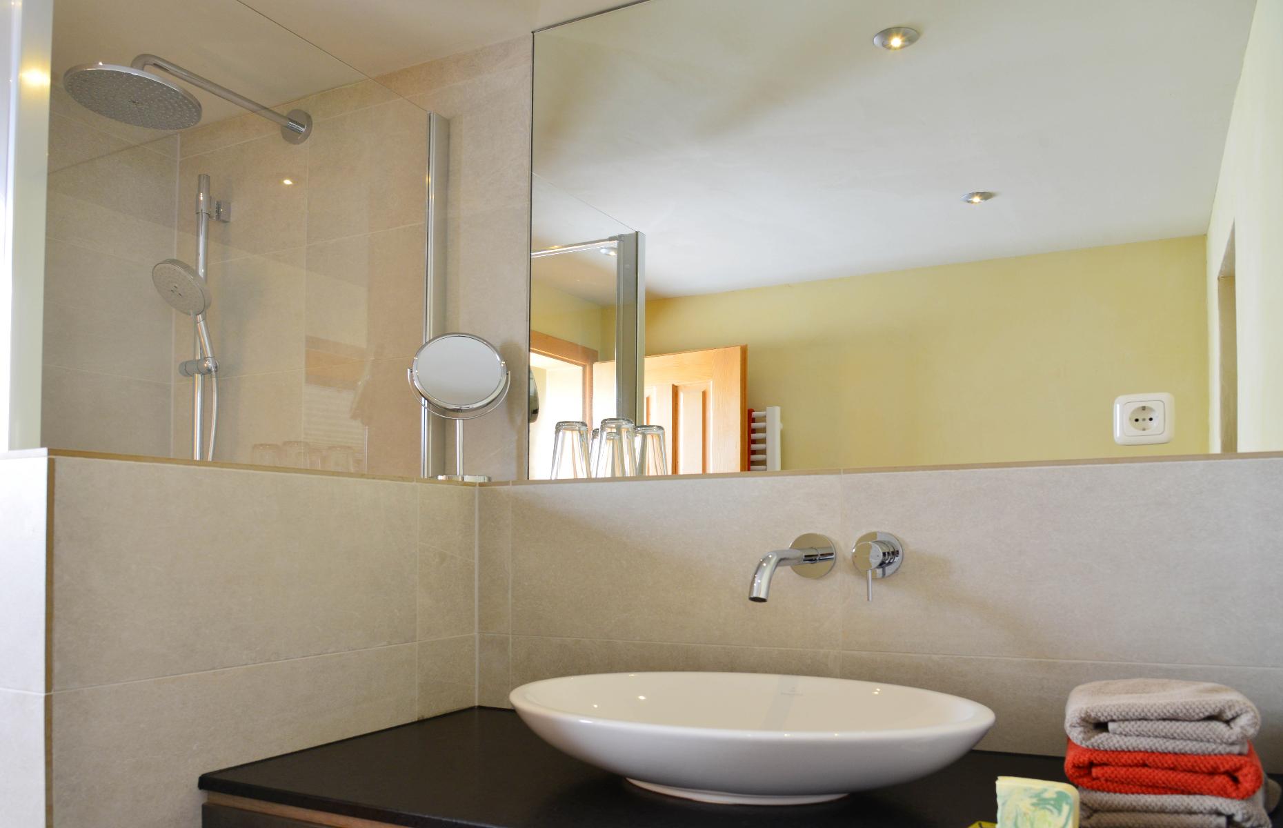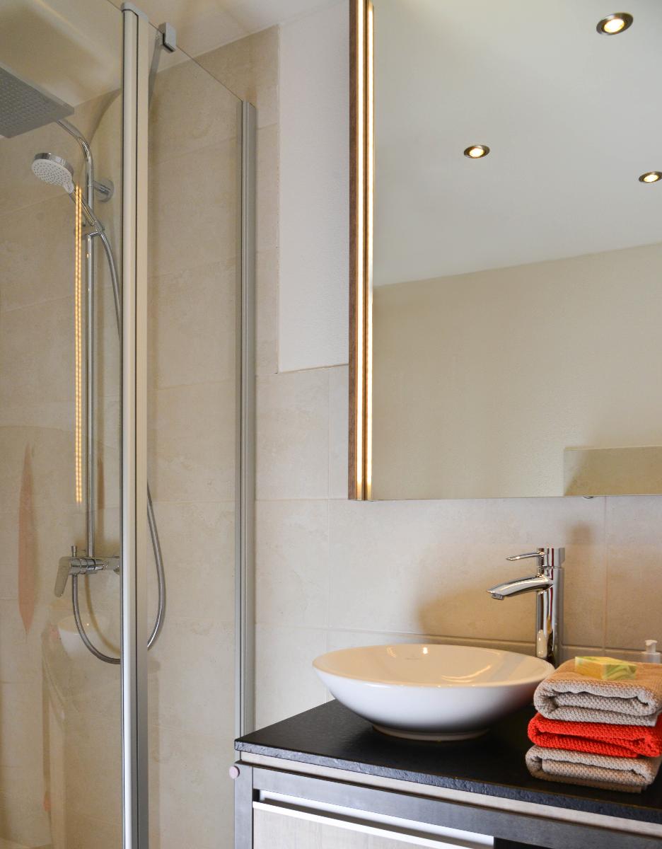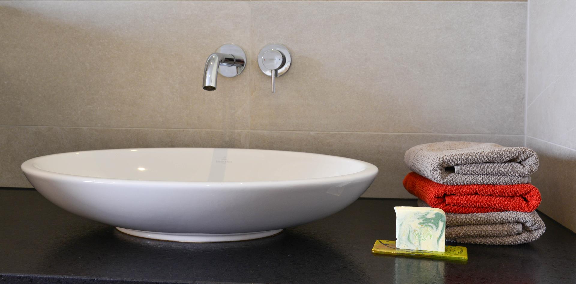 - Badezimmer mit Dusche/WC und handbemalten Glasfliesen
