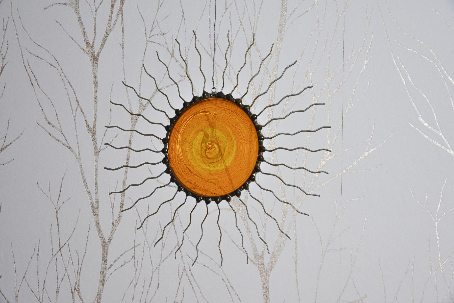Glaskunst an den Wänden und hochwertigen Vollholzmöbeln von "Grüne Erde".