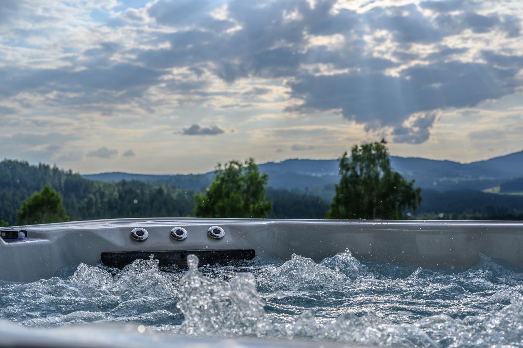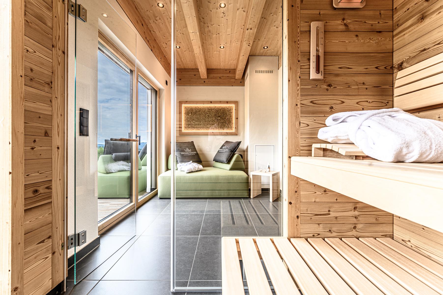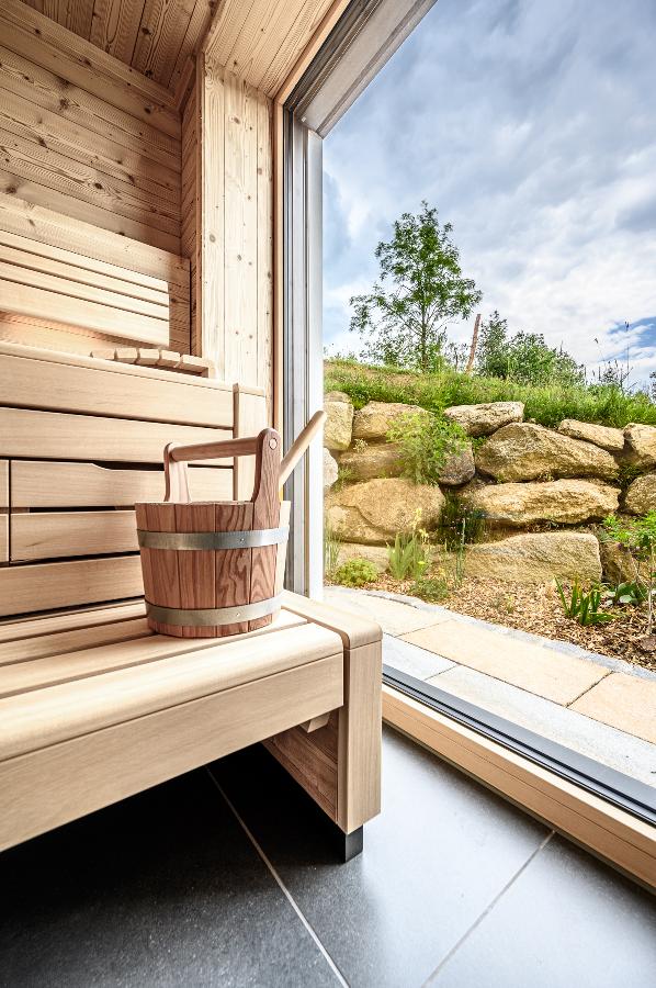 Die große Fichtenholzsauna mit Panorama-Blick und Aufgussofen inklusive direktem Zugang zum eigenen Holzdeck, exklusivem Daybed im Saunabereich und auf der Holzterrasse und der Whirlpool schenken Ihnen gemütliche Stunden mit Ihren Lieben.