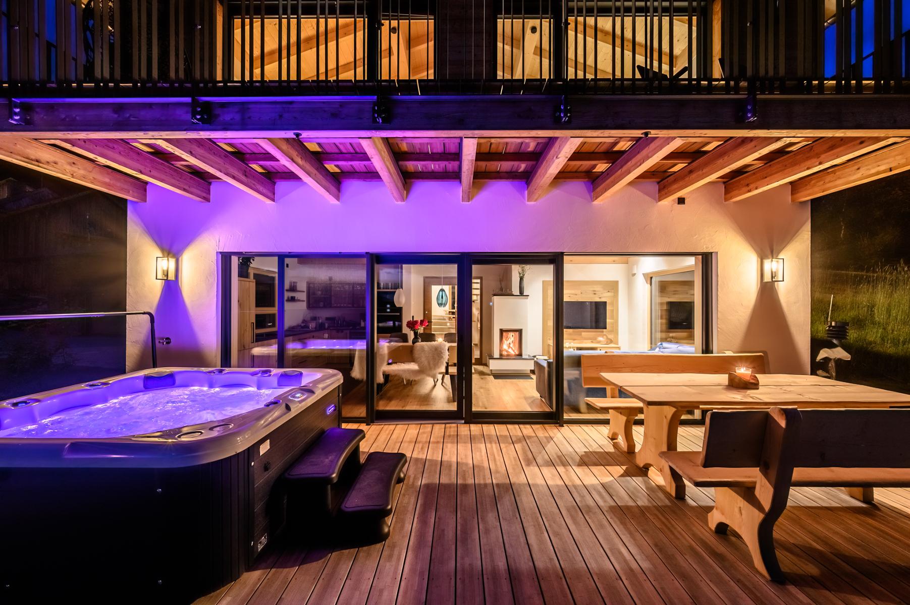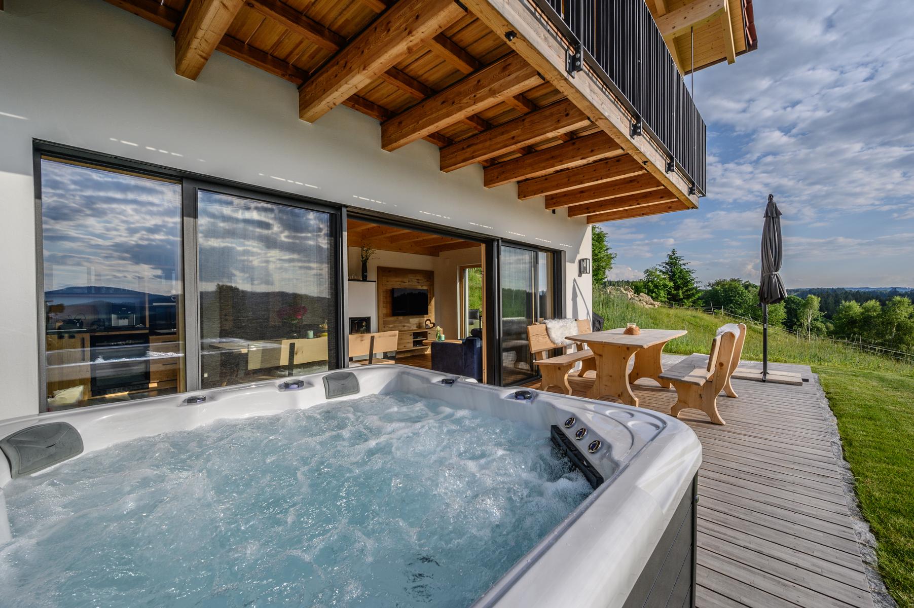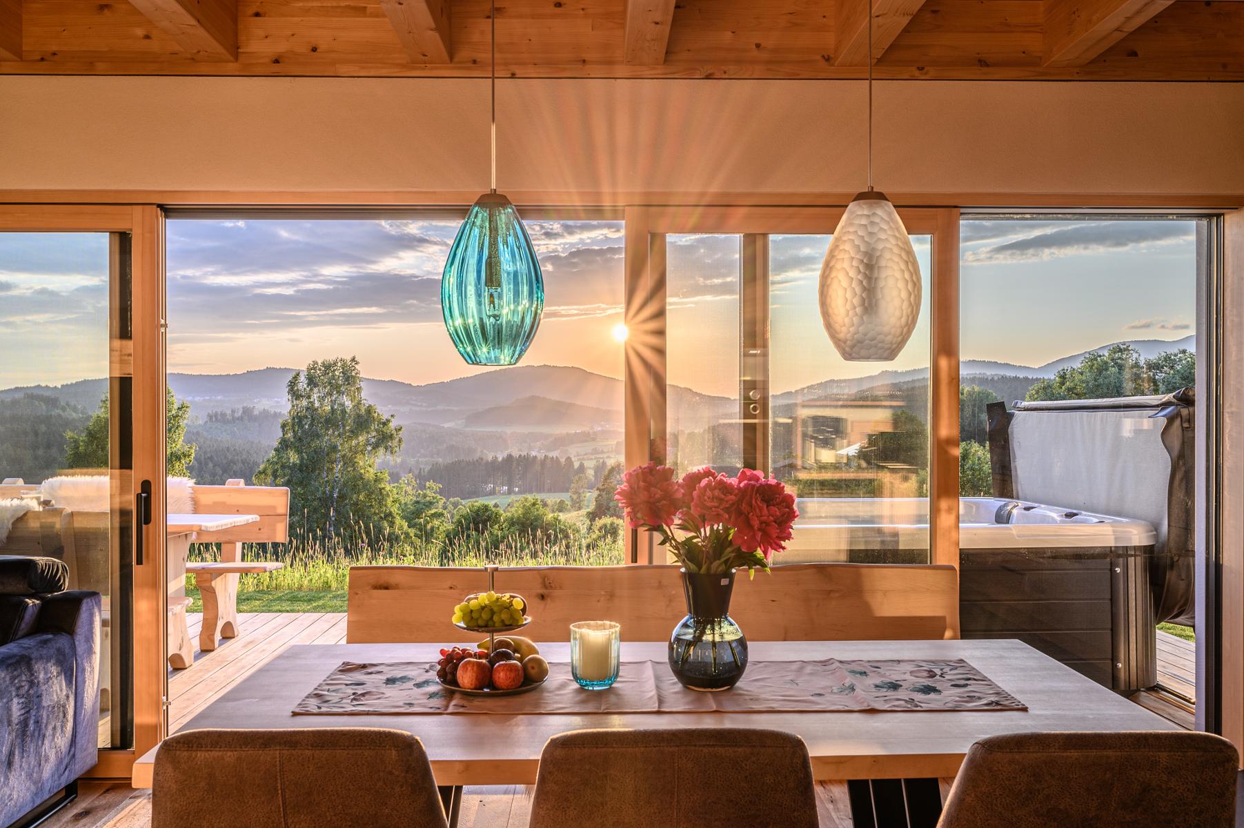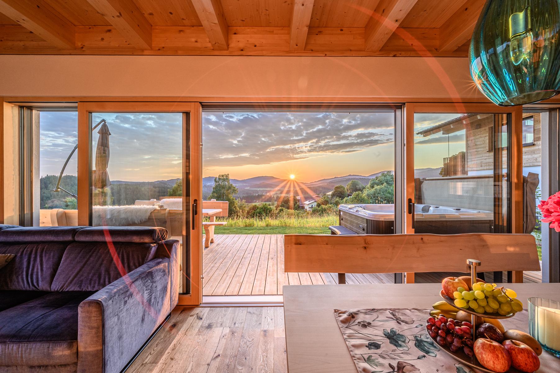 Unserenatürlich und nachhaltig eingerichteten Chalets laden mit eigenem Whirlpool auf der Panorama-Terrasse und großzügiger,eigenerNatur-Holz-Sauna zum Wohlfühlen und Entspannen ein.