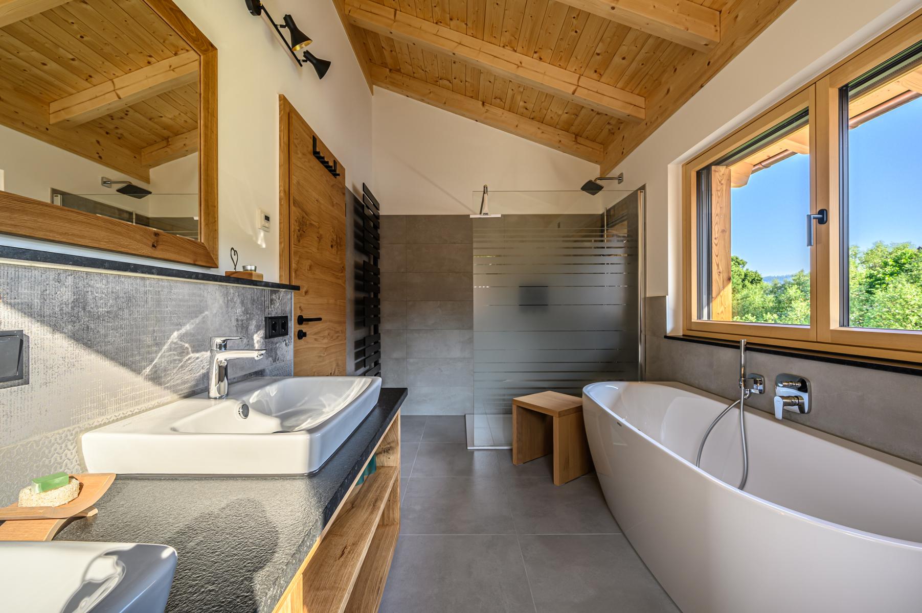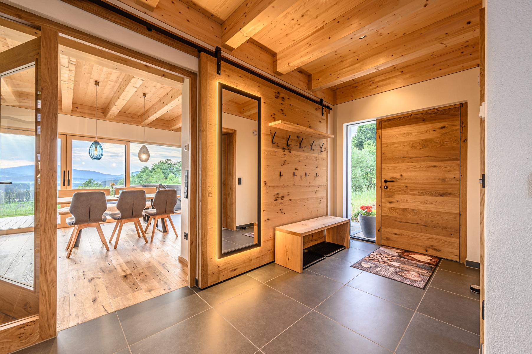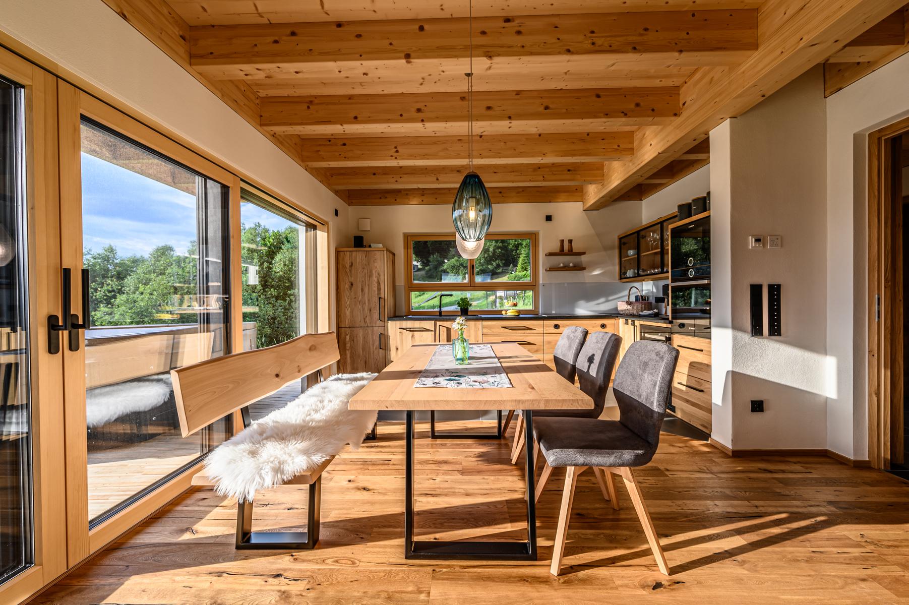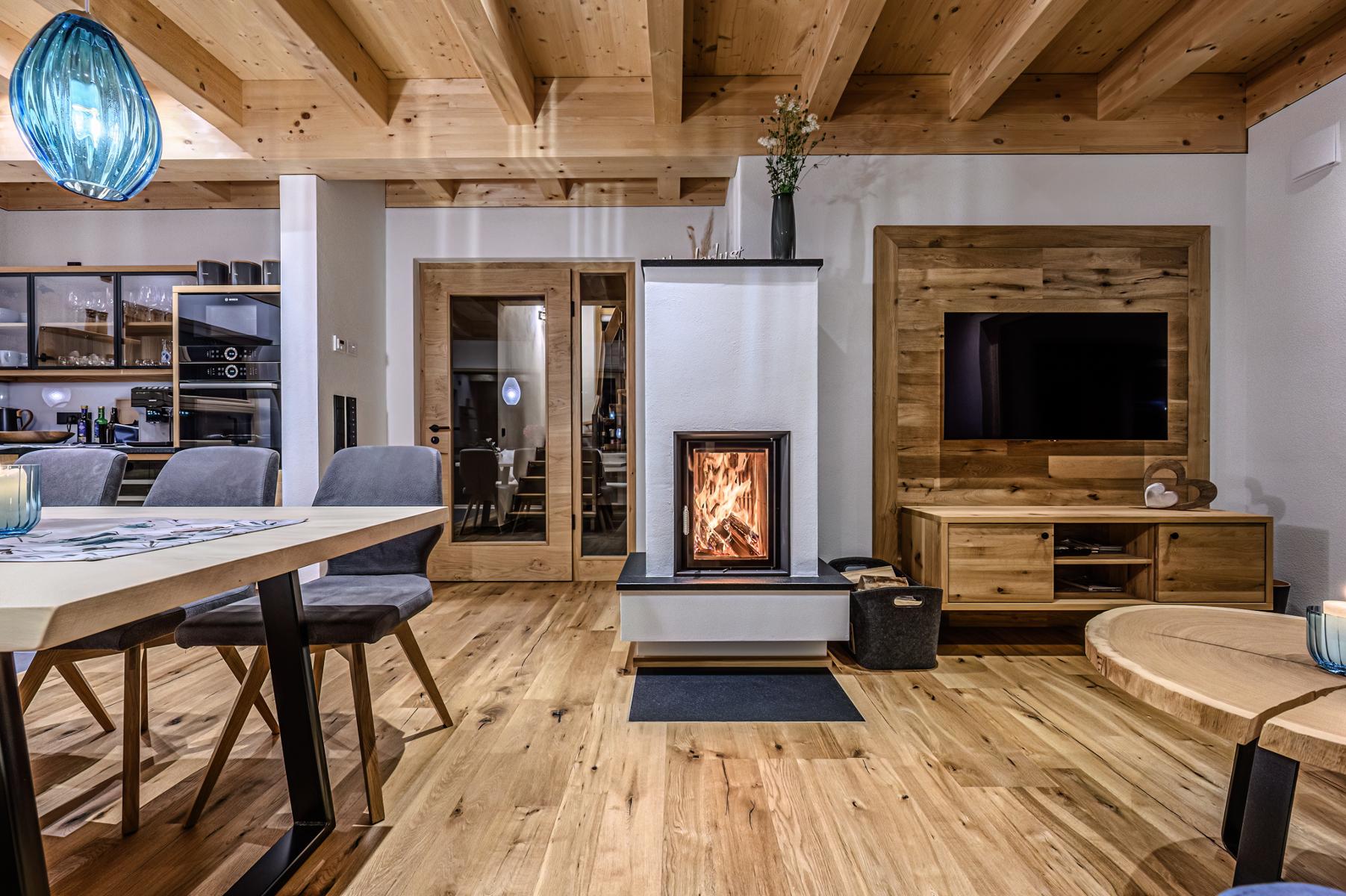 Durch die Verwendung von natürlichen Baumaterialien, wie heimischen Fichtenholz und Lehmputz wird eine einzigartige Wohlfühlatmosphäre geschaffen. Hier verschmelzen traditionelle Bauweise mit modernem Design und natürlichem Luxus.