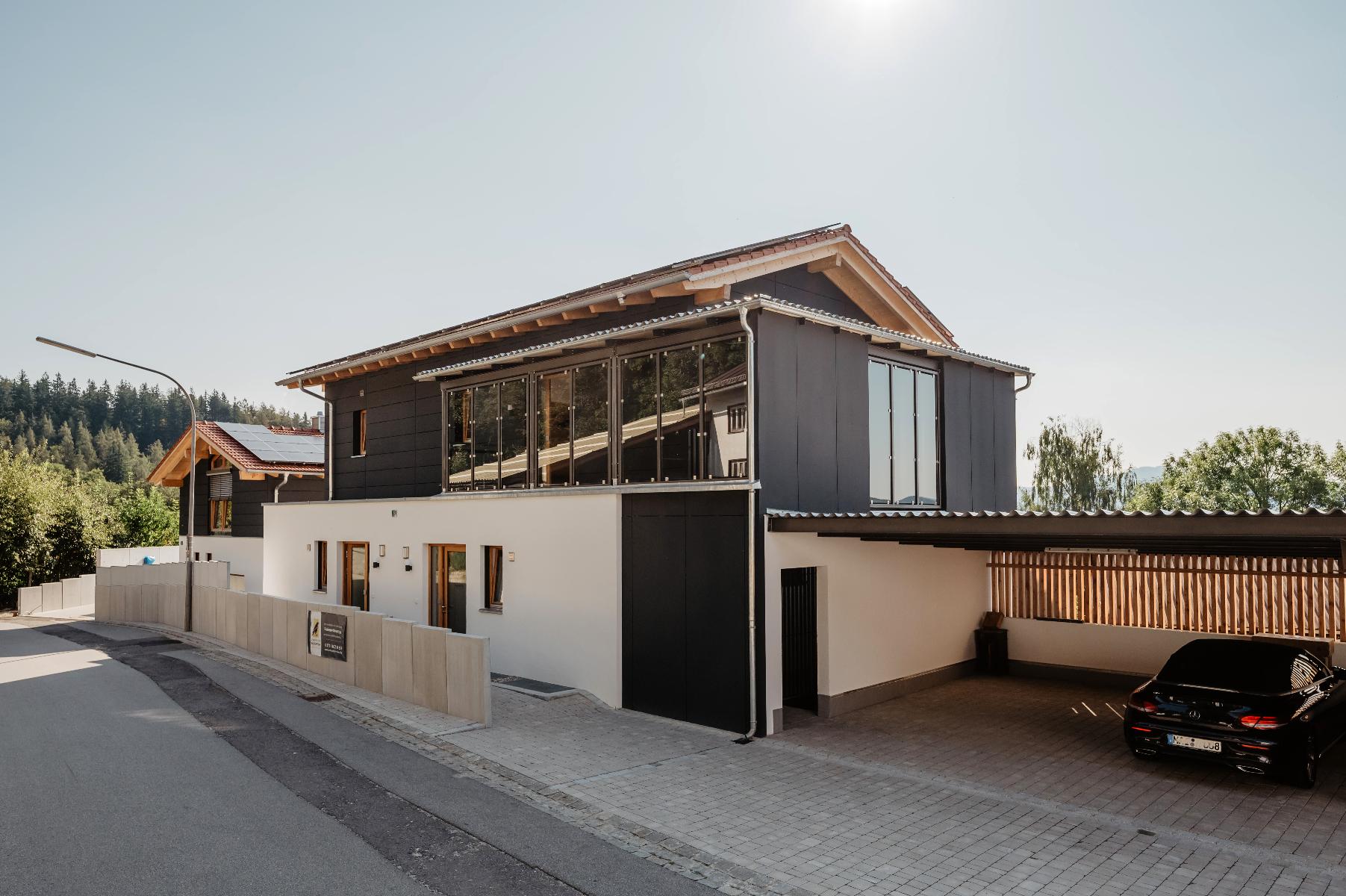 Unmittelbar am Haus befinden sich überdachte Car-Ports mit Ladestation für Ihr E-Auto, ebenso ein abschließbarer Fahrradraum.